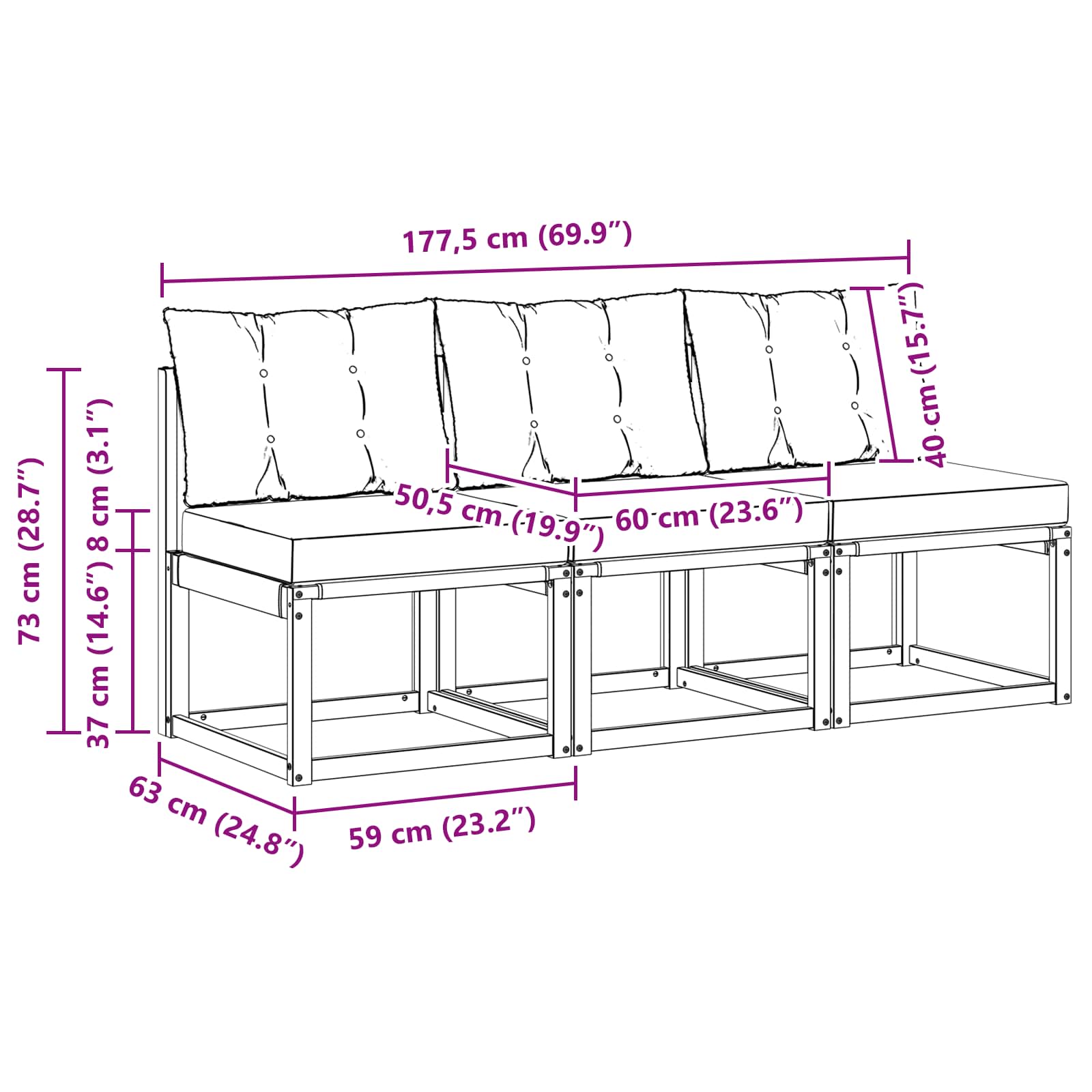- 3 x Pernă pentru Șezut: 60 x 50,5 x 8 cm (LxWxH)