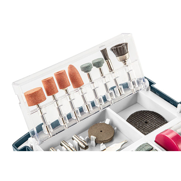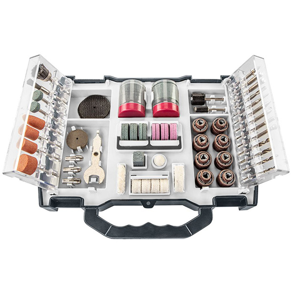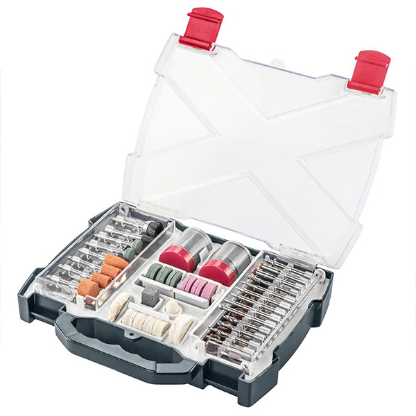 - Set de 99 buc.- Include un set de burghie, discuri de taiere, discuri abrazive, freze, pietre de slefuit, perii si benzi pentru utilizare cu mini polizoare.