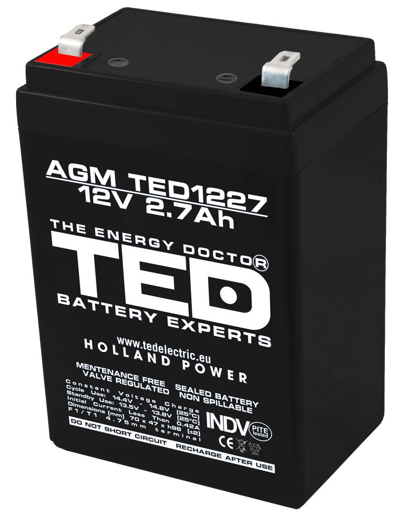 Acumulator AGM VRLA 12V 2.7Ah cu terminal F1, compact 70x47x98 mm