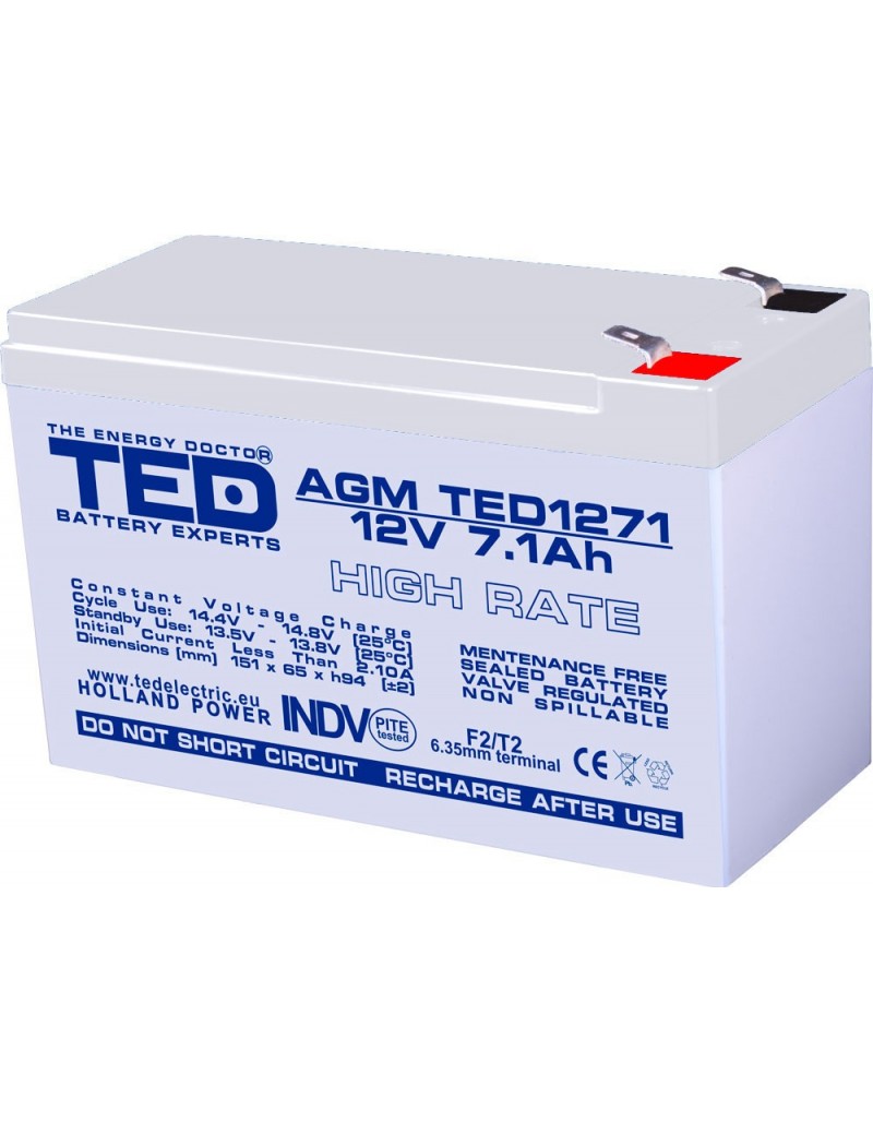 Alege un acumulator AGM VRLA 12V 7.1Ah High Rate fiabil, conceput pentru aplicatii care au nevoie de alimentare constanta si descarcare eficienta. Modelul TED Battery Experts este o baterie plumb-acid etansa, fara intretinere, potrivita pentru UPS, sisteme de alarma, echipamente de backup, automatizari si alte aplicatii electronice compatibile.