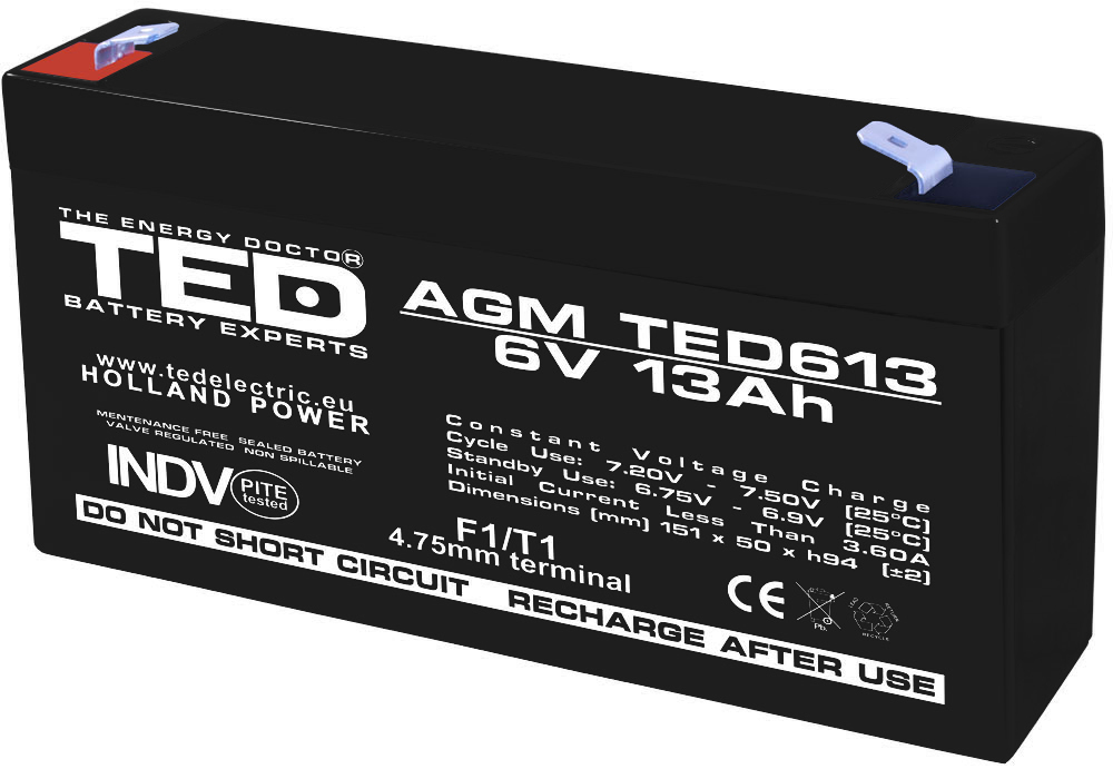 Descriere Acumulator AGM VRLA 6V 13Ah terminal