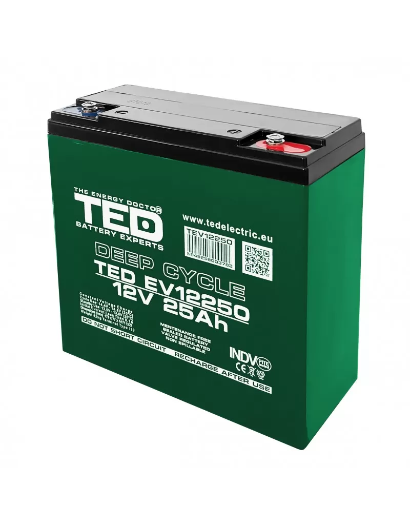 Acest acumulator TED 12V 25Ah poate fi folosit pentru vehicule electrice usoare, sisteme de rezerva, echipamente mobile si alte aplicatii compatibile care necesita un acumulator deep cycle cu dimensiuni compacte si autonomie buna raportata la capacitate.