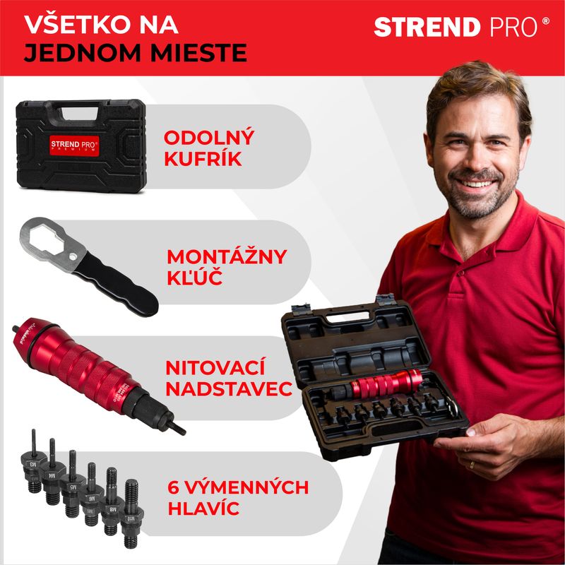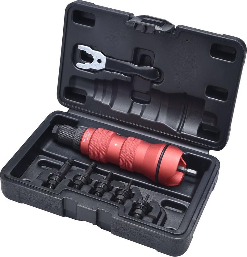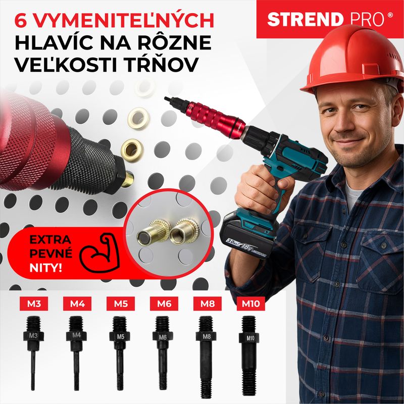 Adaptorul de nituit piulițe pentru bormașină Strend Pro Premium este soluția practică pentru montaj rapid și precis al piulițelor nituibile (nituri filetate) în tablă și profile. Este compatibil cu dimensiunile M3, M4, M5, M6, M8, M10 și poate fi folosit cu piulițe din oțel, inox și aluminiu. Vine într-o valiză pentru transport și depozitare ușoară.