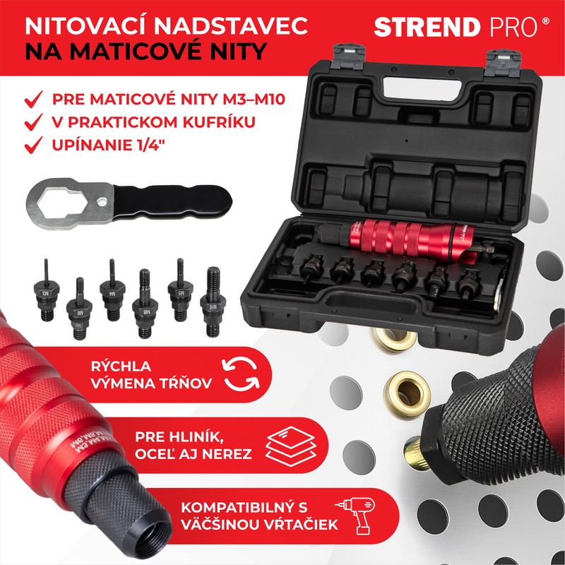 Adaptor de nituit piulite pentru bormașină Strend Pro Premium M3–M10, 1/4", cu valiză