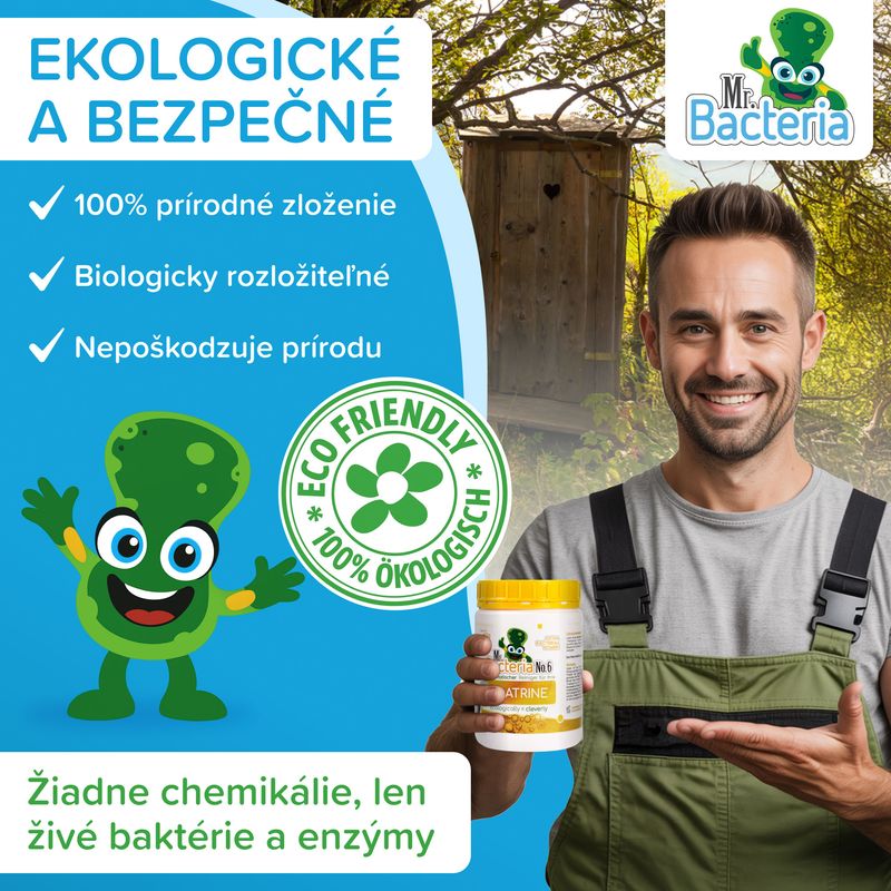Mr.Bacteria No.6 je biologický aktivátor určený na údržbu latrín a suchých WC, ktorý obsahuje iba voľne sa v prírode vyskytujúce baktérie a enzýmy. Prípravok naštartuje biodegradačné procesy, čím zabraňuje tvorbe usadenín a kalov a optimalizuje bakteriálnu účinnosť v odpadových systémoch. Vďaka svojmu pôsobeniu dochádza k úplnému rozloženiu suchých a tuhých exkrementov, ktoré sa môžu hromadiť aj niekoľko rokov, pričom sa zastavuje ich opätovné usadzovanie. Jedným z hlavných prínosov je výrazné zníženie až úplné odstránenie nepríjemného zápachu.