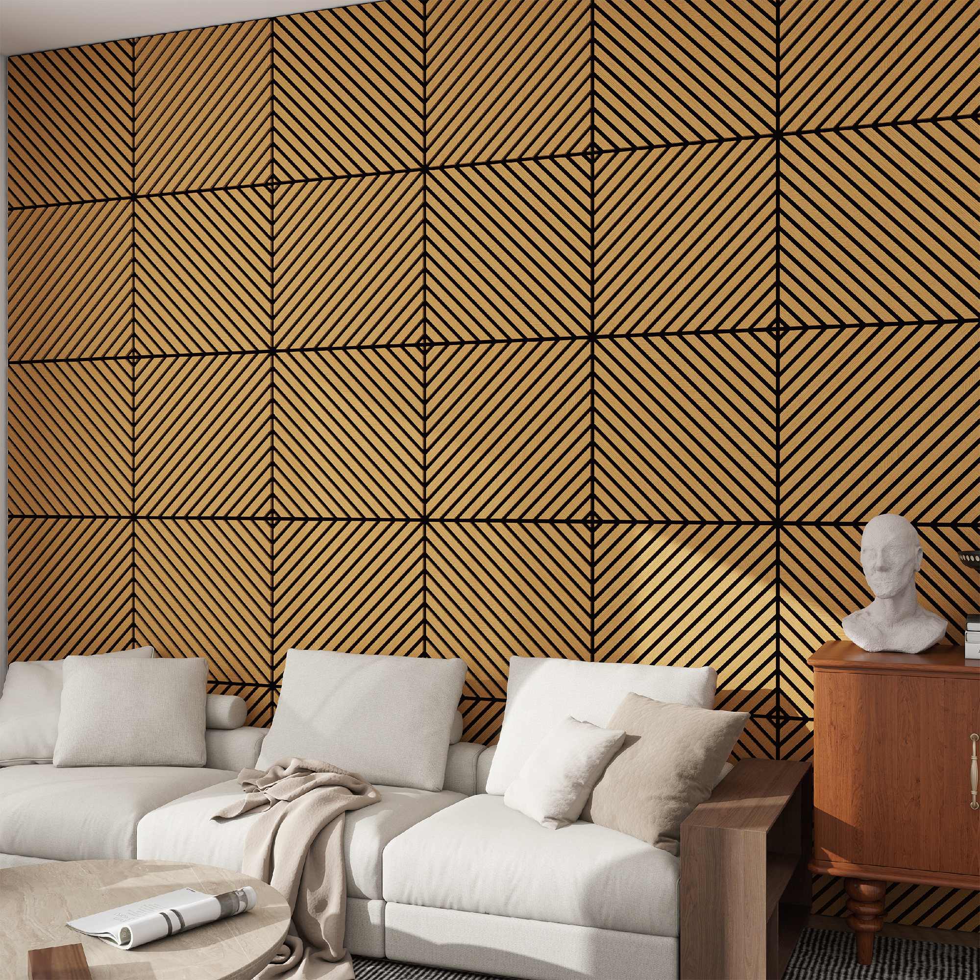 - Acht 3D-Akustikpaneele im Set mit diagonal verlaufendem Lamellendekor