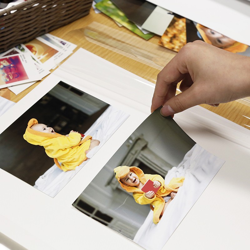 Cum se foloseste: ridica usor folia transparenta din interior spre exterior, aseaza fotografiile pe suprafata autoadeziva, apoi acopera-le la loc cu folia pentru a le fixa si proteja.