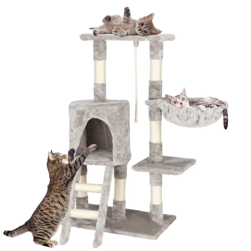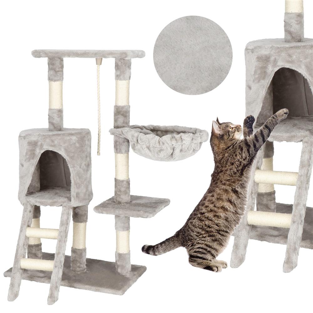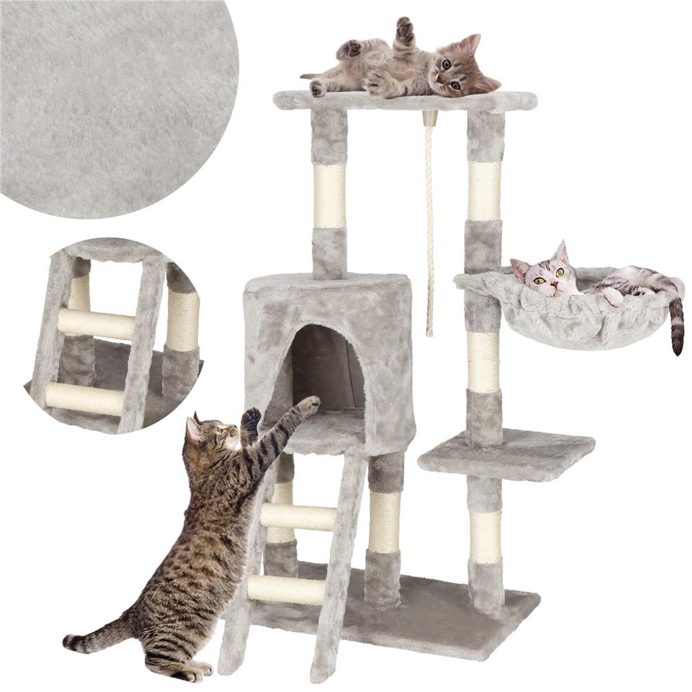 Oferă-i felinei tale un spațiu complet pentru joacă, odihnă și ascuțirea ghearelor cu acest ansamblu de joacă pentru pisici de 96 cm. Modelul include stâlpi de zgâriat din sisal, o căsuță ascunsă, platforme de observare, culcuș suspendat și sfoară pentru joacă. Finisajul moale, în nuanță gri, este plăcut la atingere și se integrează ușor în orice locuință.