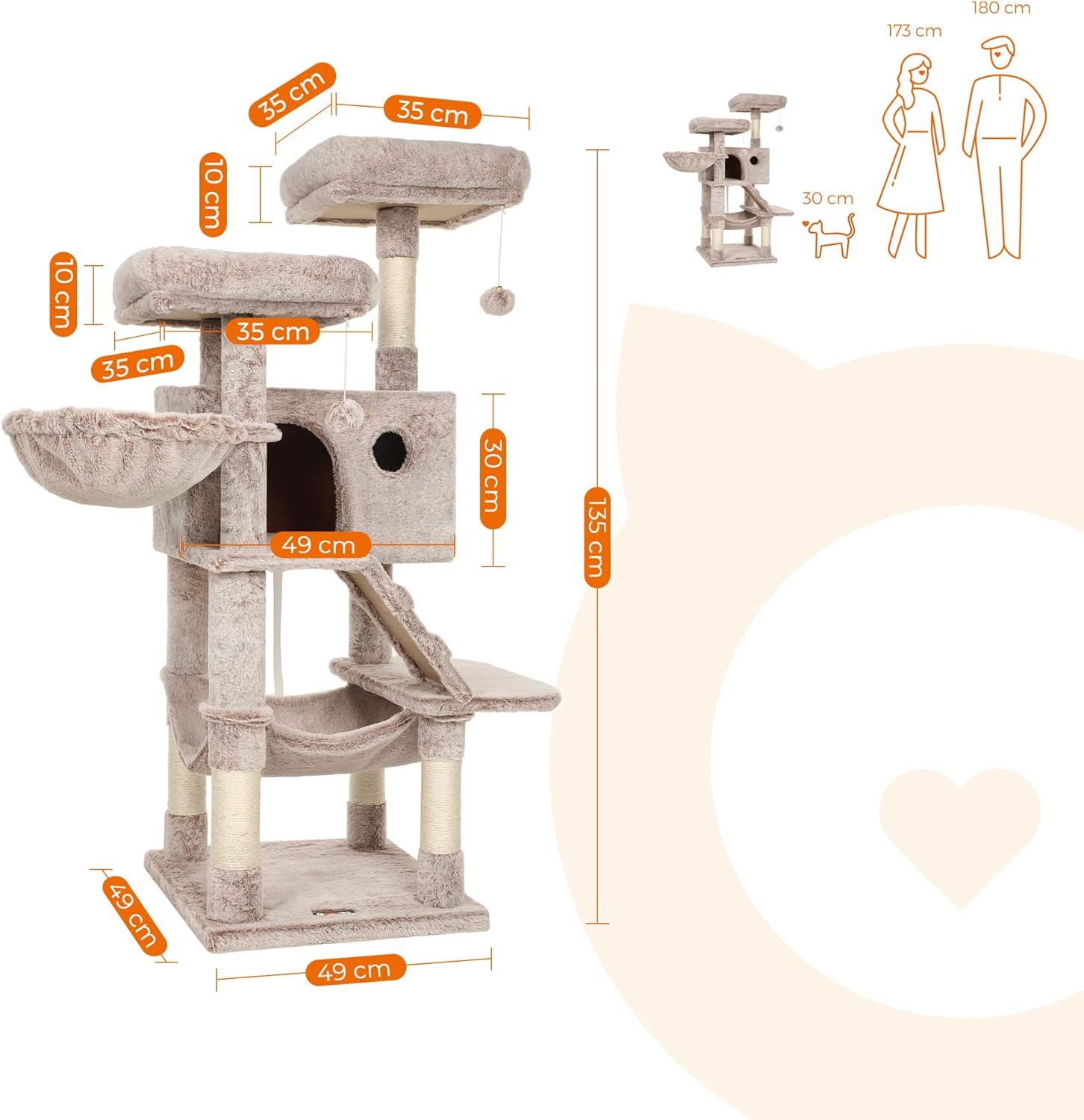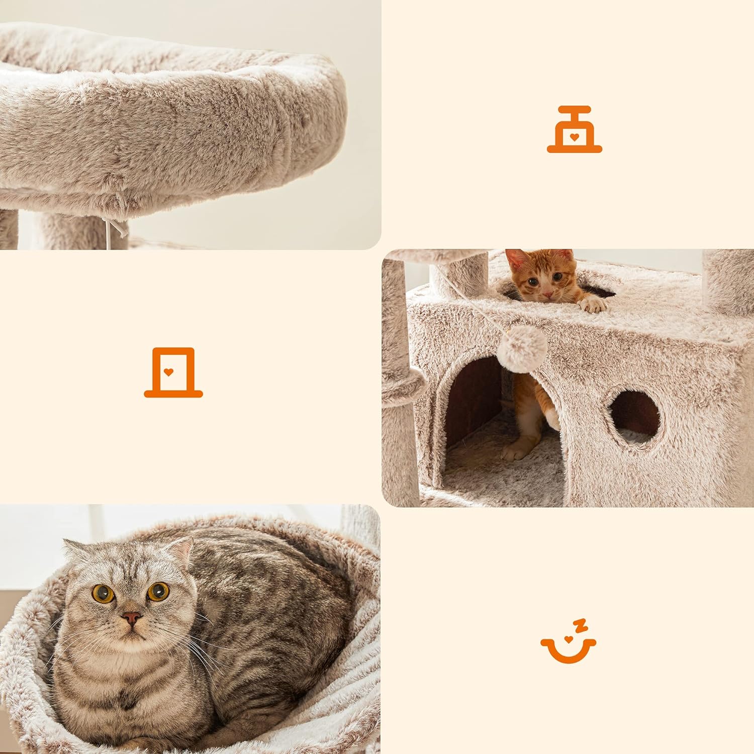 Ansamblu de joacă pentru pisici FEANDREA, 135 cm, cu hamac și 3 culcușuri, maro deschis