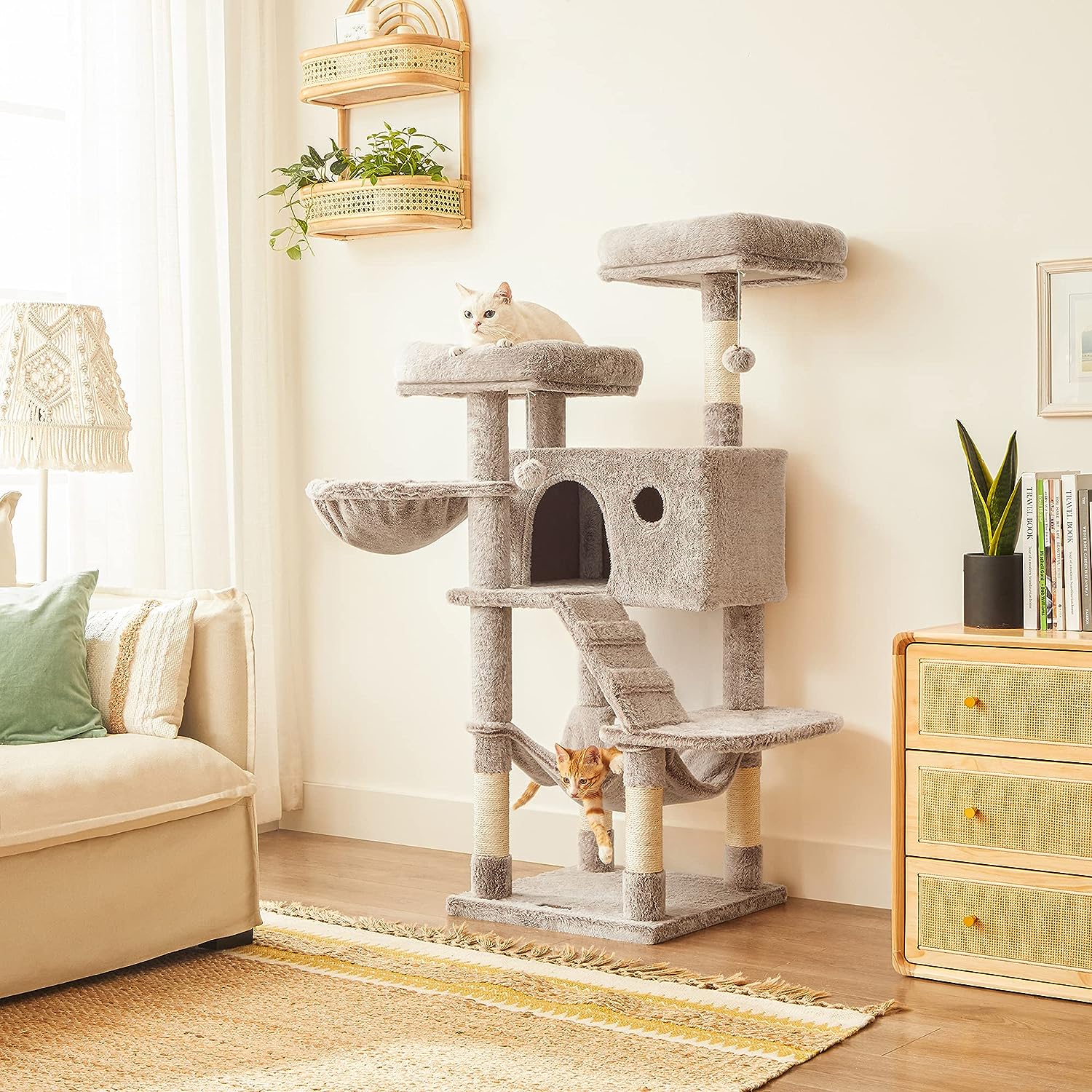 - Funcții: culcușuri, hamac, ascunzătoare, stâlpi de zgâriat, scară, jucării suspendate