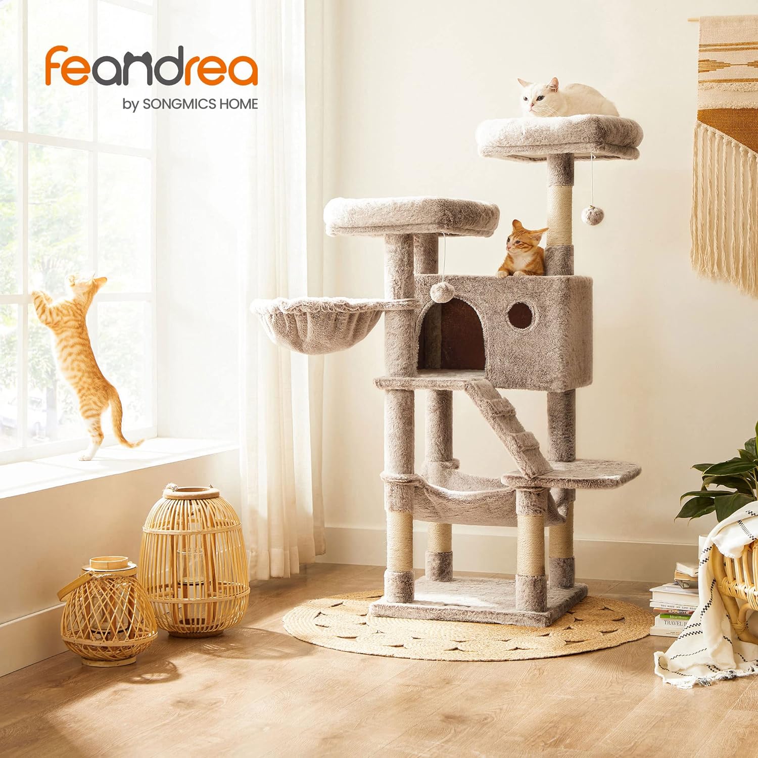 Oferă-i felinei tale un spațiu complet pentru relaxare, joacă și ascuțirea ghearelor cu acest ansamblu de joacă pentru pisici FEANDREA. Cu o înălțime de 135 cm, mai multe niveluri confortabile, hamac pentru pisici, ascunzătoare și stâlpi îmbrăcați în sisal, acest copac pentru pisici este ideal pentru pisici active, curioase sau care adoră să stea la înălțime. Finisajul plușat, moale și dens, creează un loc primitor în care pisica se poate simți în siguranță chiar și când tu nu ești acasă.