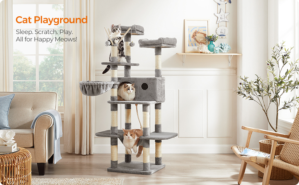 Datorita designului tip scara, pisoii si pisicile adulte pot urca usor de pe un nivel pe altul. Hamacul, ascunzatoarea, culcusurile superioare si jucariile suspendate stimuleaza instinctul natural de joaca si ofera relaxare in fiecare zi. In plus, stalpii pentru zgariat ajuta la protejarea canapelei si a mobilierului.