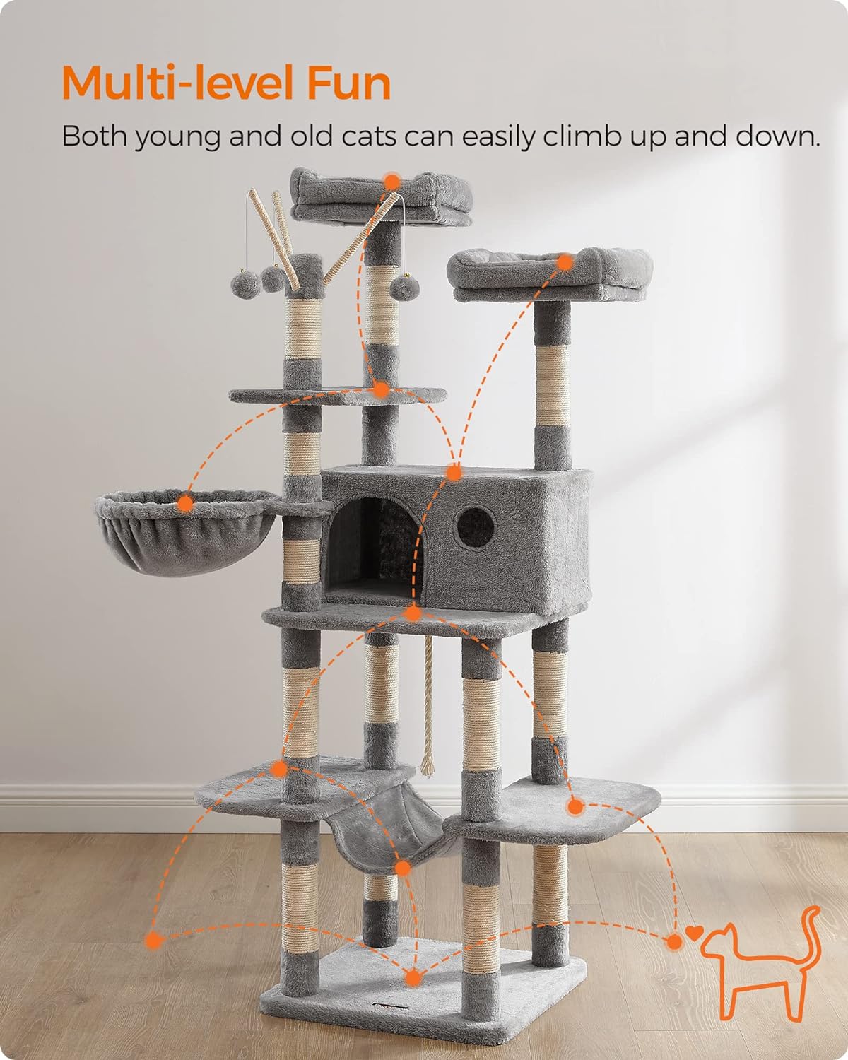 Ansamblu de joaca pentru pisici FEANDREA, 3 culcusuri, hamac, 164 cm, gri deschis