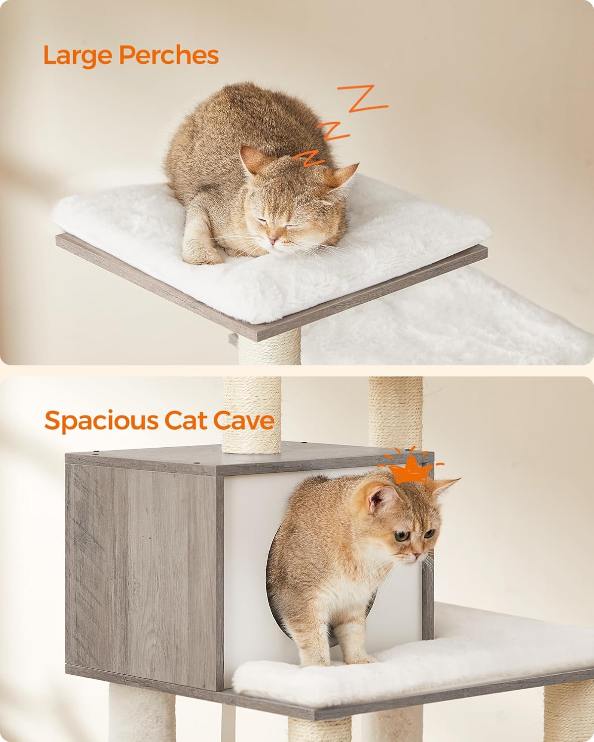 Oferă-i felinei tale un loc complet pentru joacă, odihnă și ascuțirea ghearelor cu acest ansamblu de joacă pentru pisici FEANDREA. Cu un design modern în nuanțe de alb și gri, acest copac pentru pisici se integrează ușor în locuință și pune la dispoziție mai multe zone de relaxare: platforme de observare, ascunzătoare confortabilă și hamac pufos. Materialele moi și stâlpii acoperiți cu sisal îl transformă într-un spațiu ideal pentru pisici active sau somnoroase.