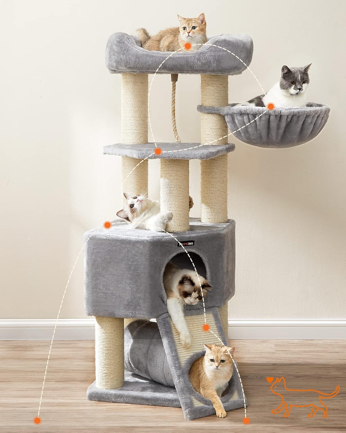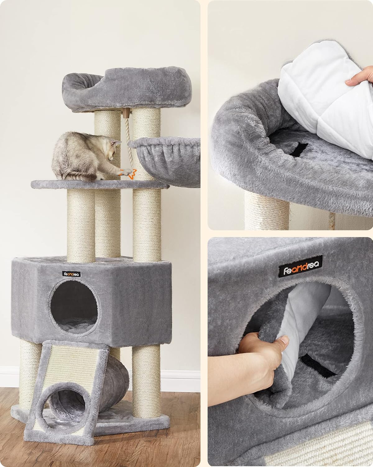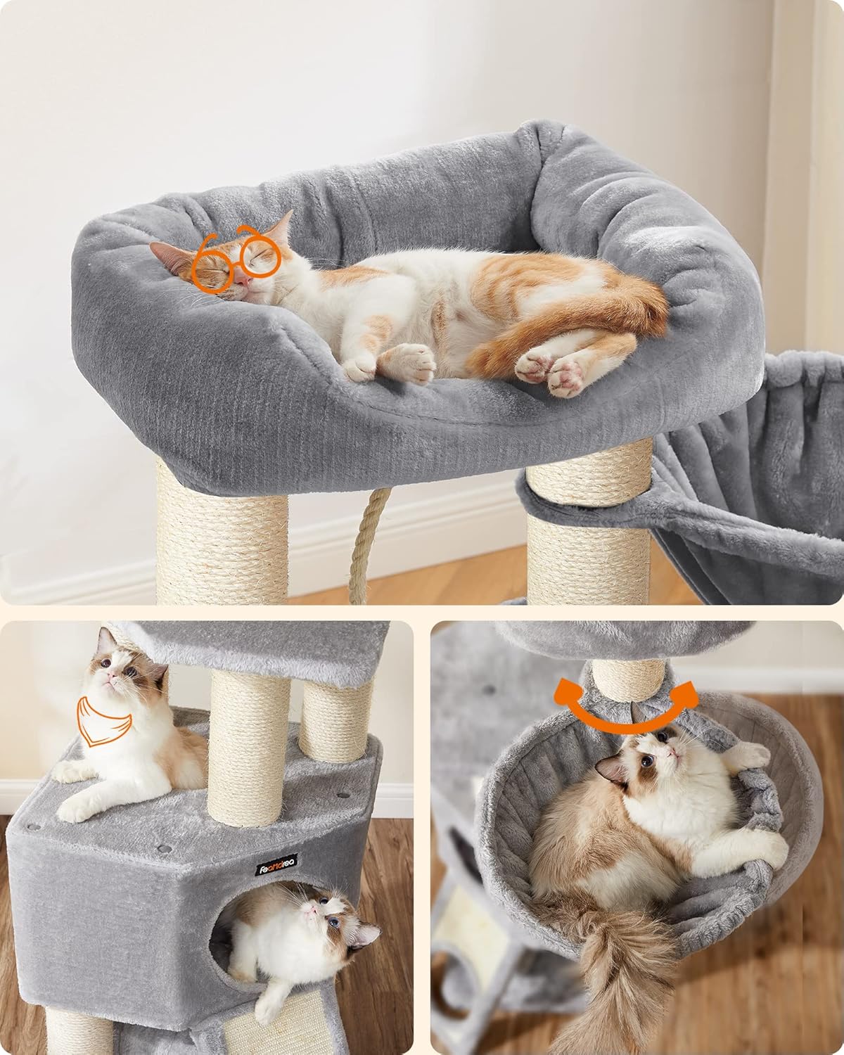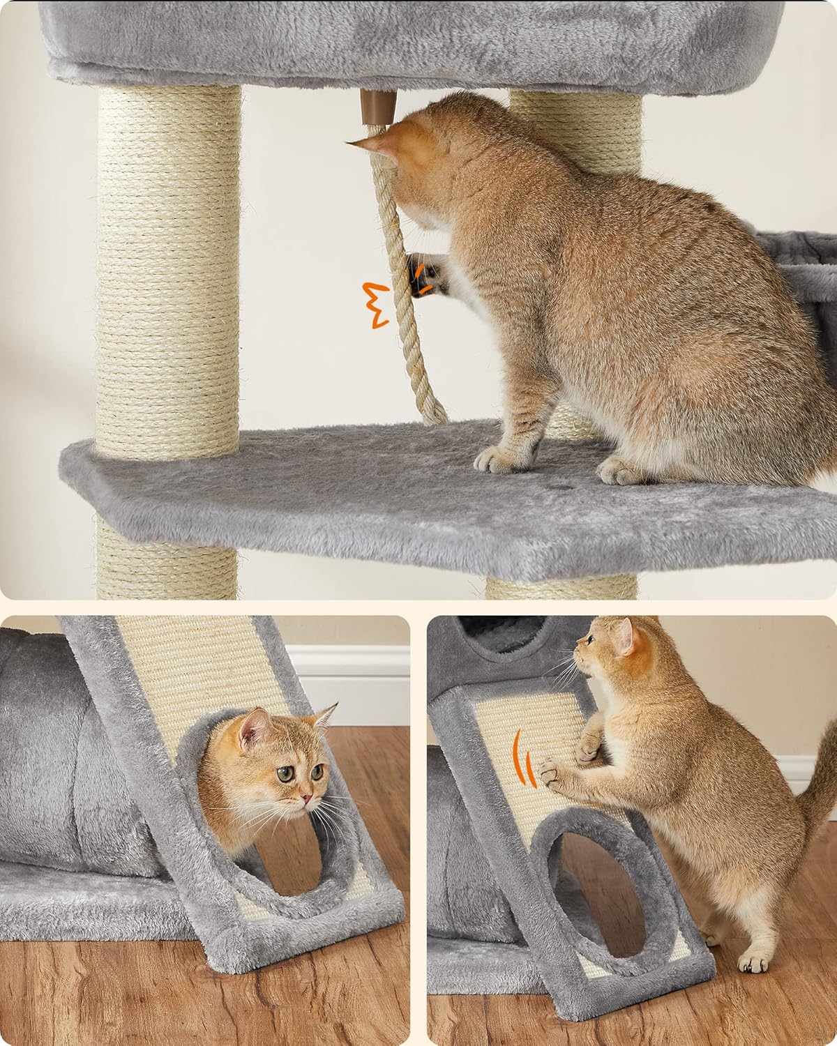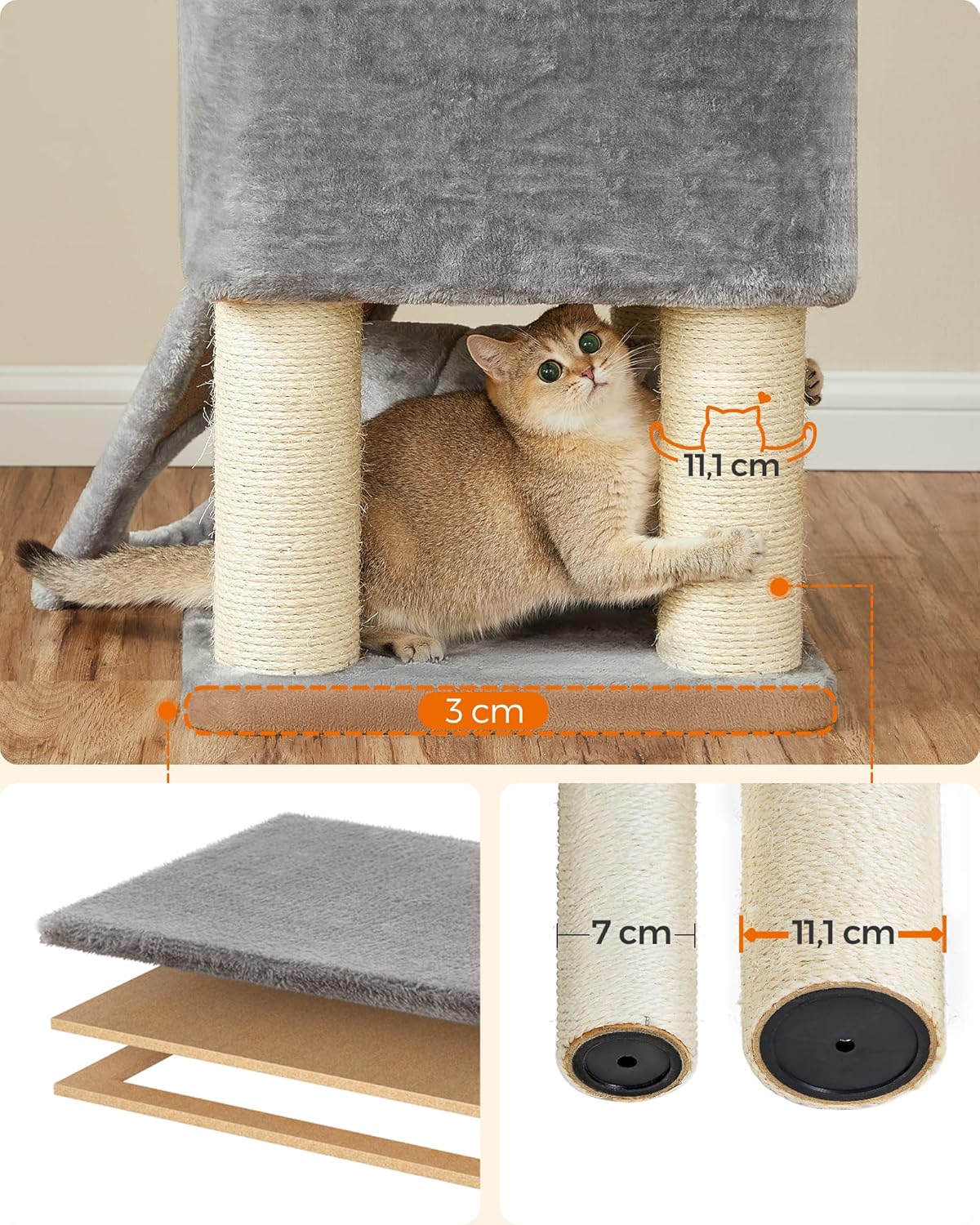 Acest ansamblu pisici gri este alegerea potrivita daca vrei sa combini confortul cu rezistenta si sa oferi animalului tau un loc atragator pentru joaca zilnica si odihna.
