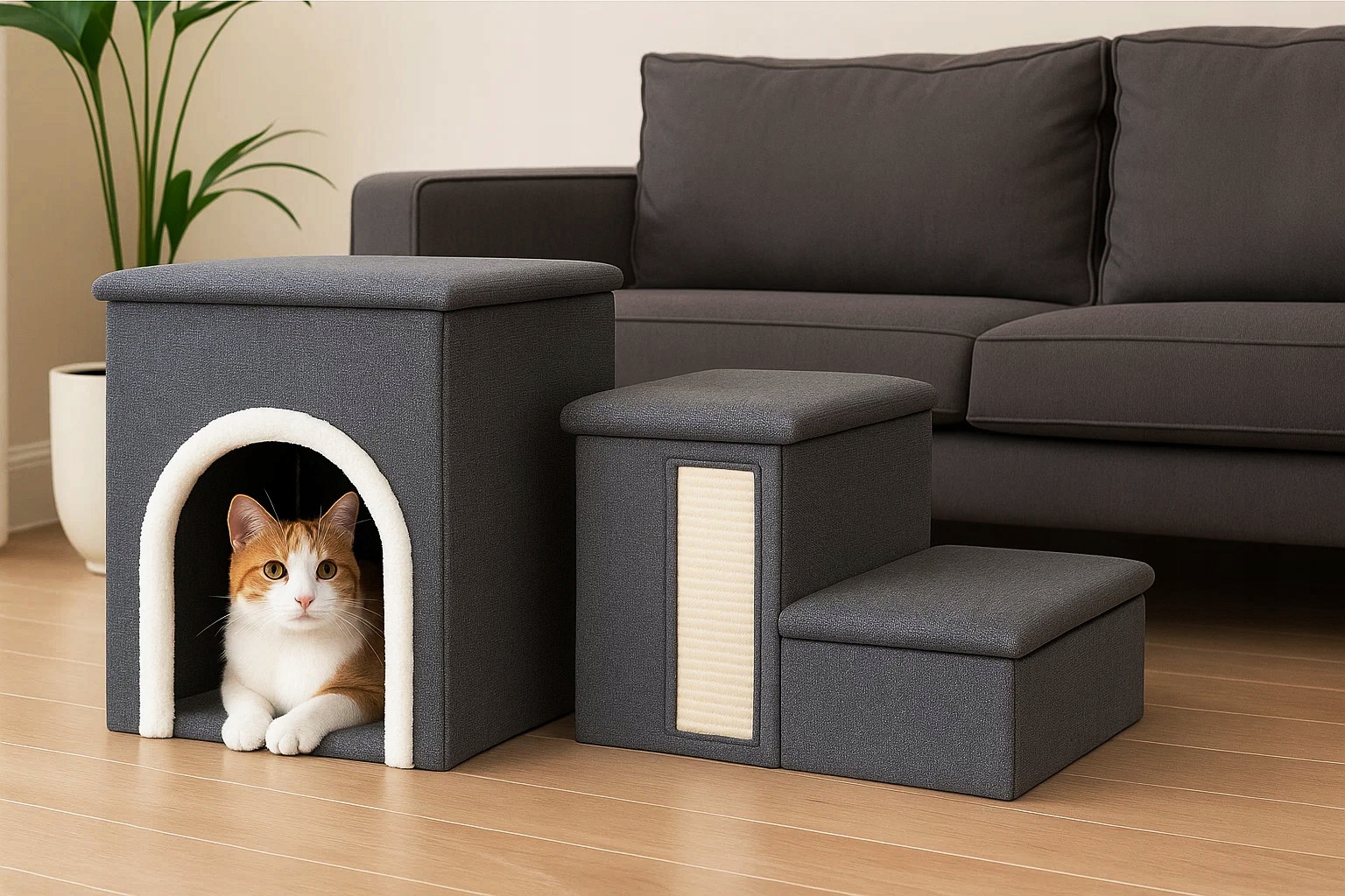 Descriere Ansamblu zgariat pisici 3in1 trepte, casuta