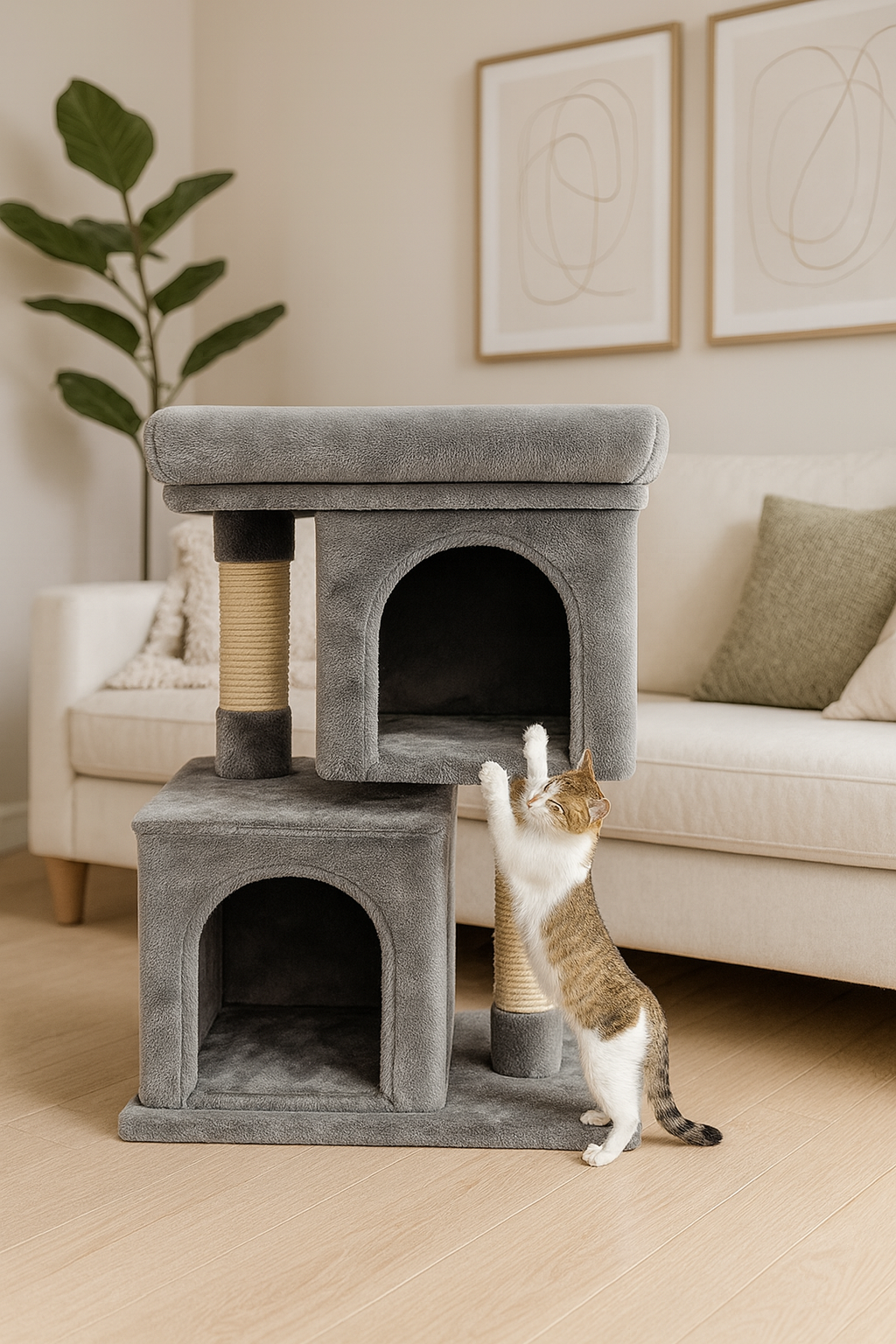 Acest turn de joaca pentru pisici este ideal pentru utilizare zilnica in apartament sau casa. Suprafetele moi invita la relaxare, iar zonele de zgariat sustin comportamentul natural al pisicii. Culoarea gri se integreaza usor in decor, iar montajul este rapid.