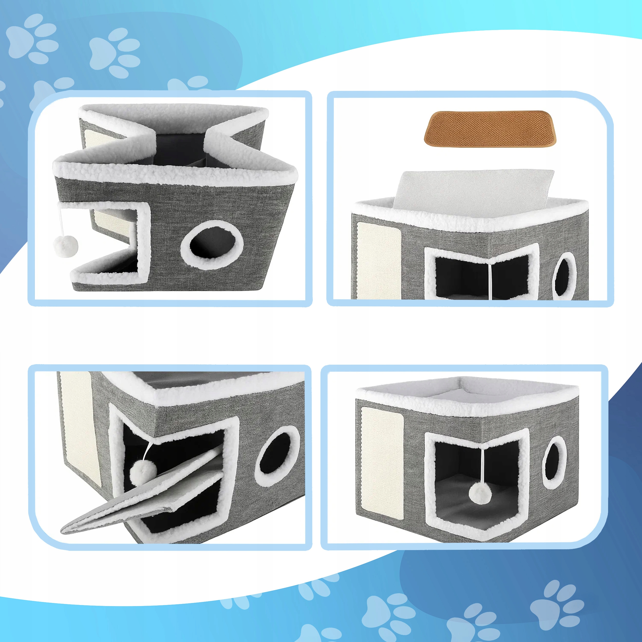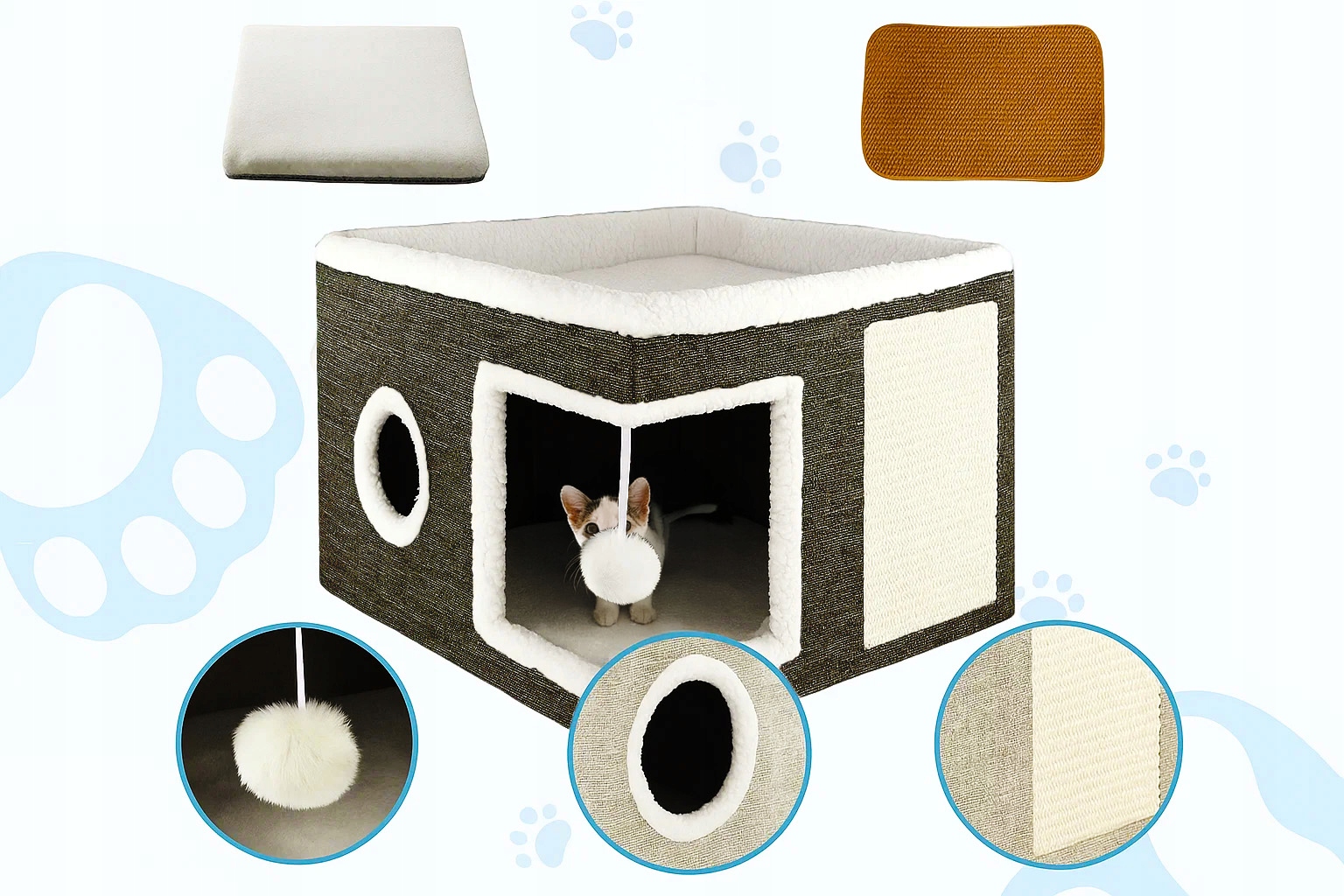 Descriere Ansamblu zgariat pisici casuta, pat superior