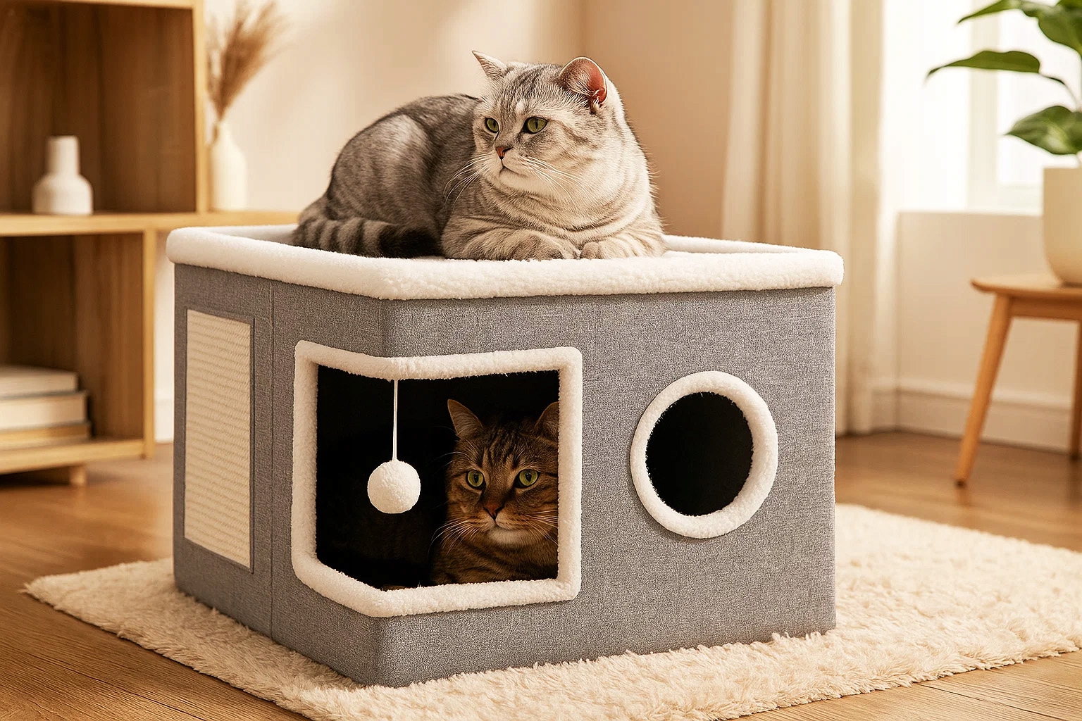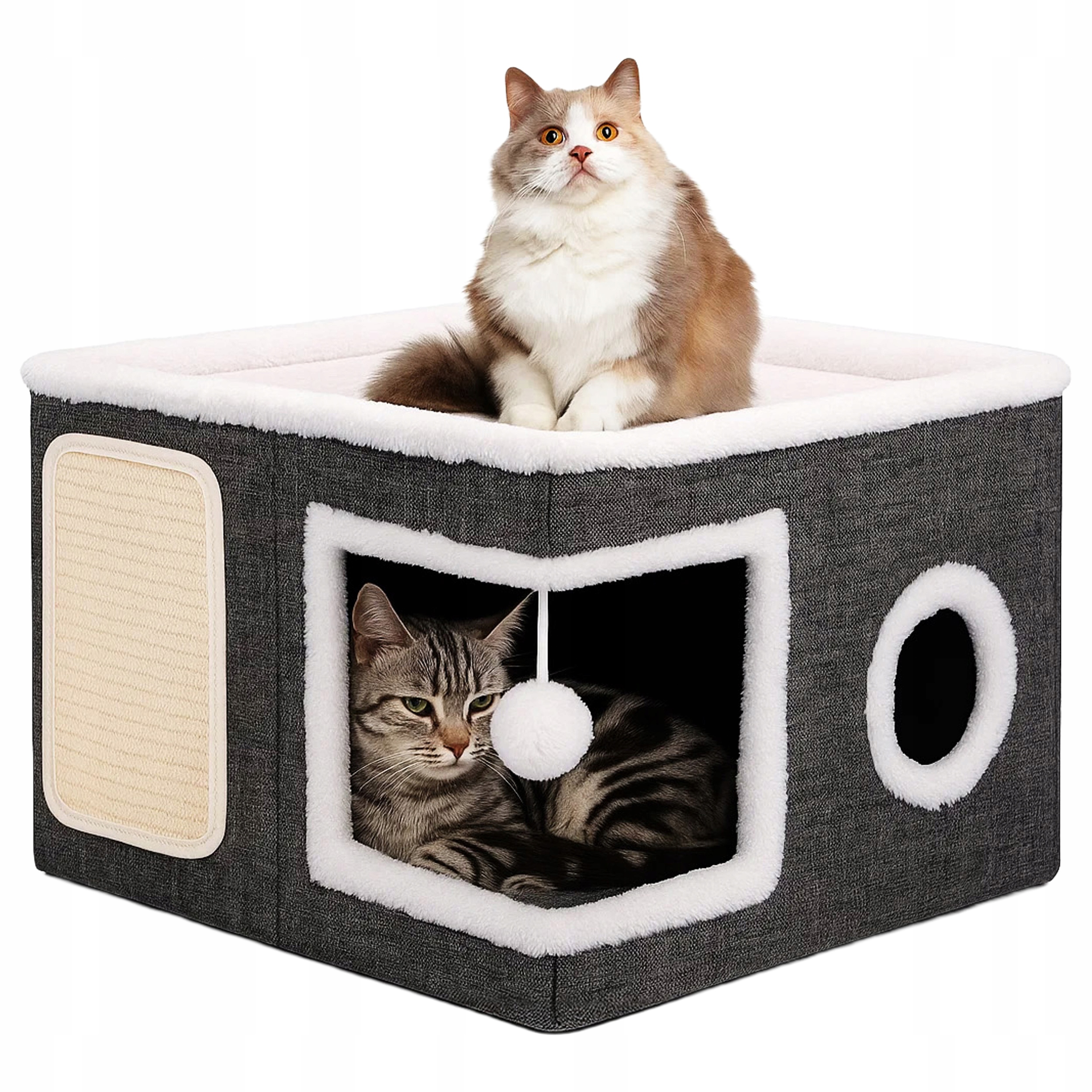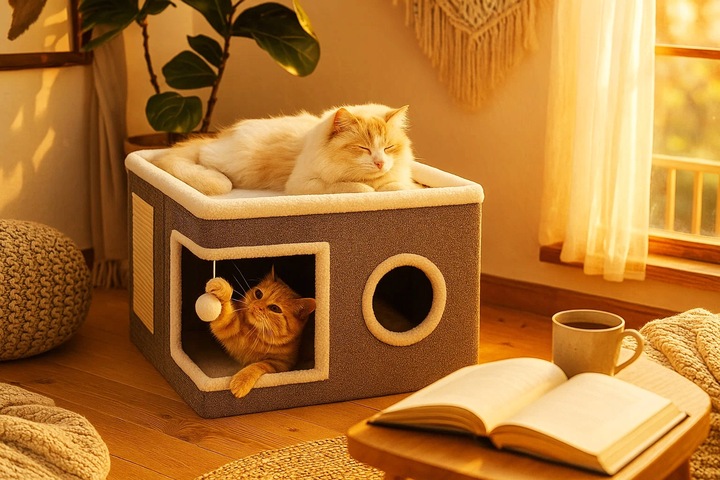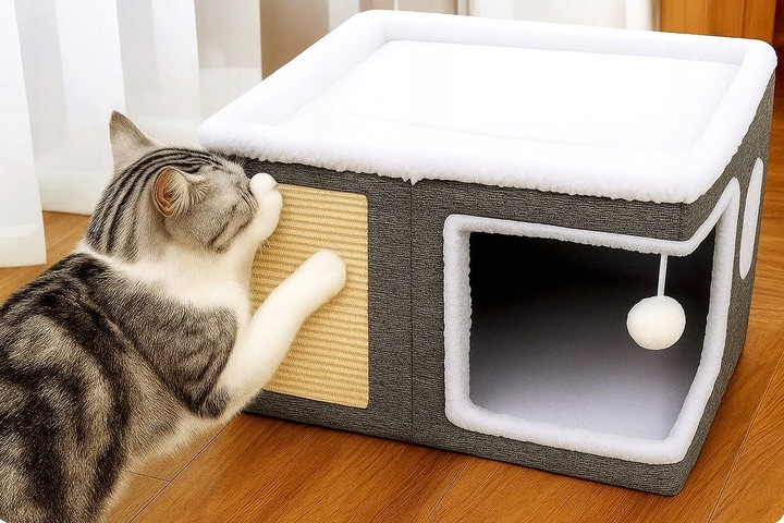 Ofera-i felinei tale un spatiu complet pentru joaca, relaxare si ingrijirea ghearelor cu acest ansamblu de zgariat pentru pisici. Modelul include o casuta pentru pisici confortabila, un pat superior moale, o suprafata exterioara pentru zgariat si o jucarie suspendata care stimuleaza curiozitatea si miscarea zilnica. Este o alegere practica pentru pisicile care au nevoie de un loc propriu in casa, fara sa ocupe mult spatiu.