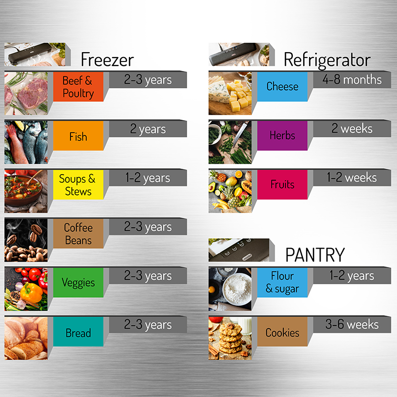 Ciclul complet de vid si etansare depinde de dimensiunea, umiditatea si tipul de alimente si poate varia de la 20 de secunde pana la 1 minut