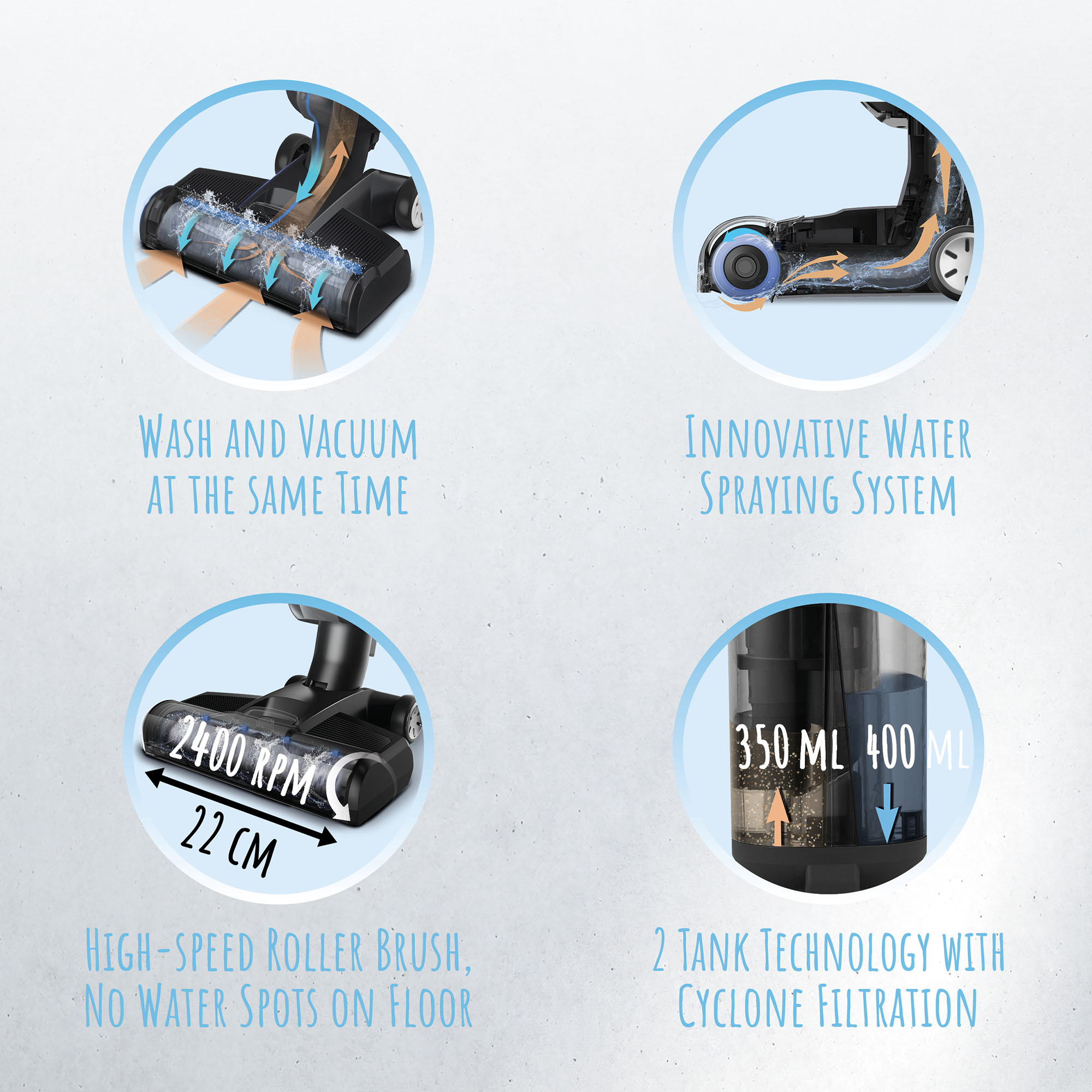 - Aspiră, spală umed și usucă parțial într-o singură etapă