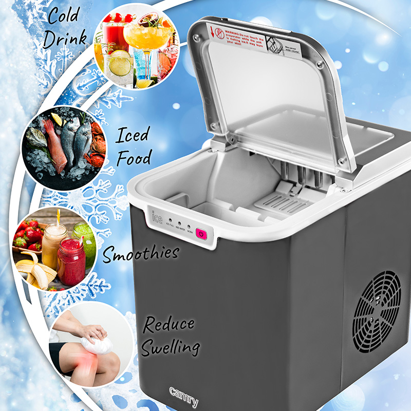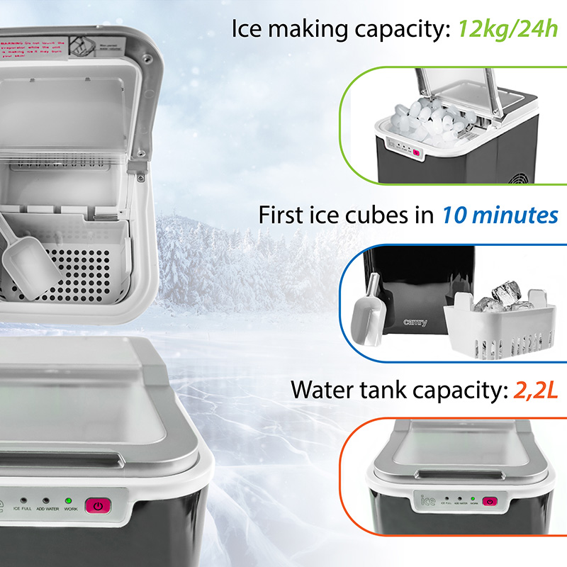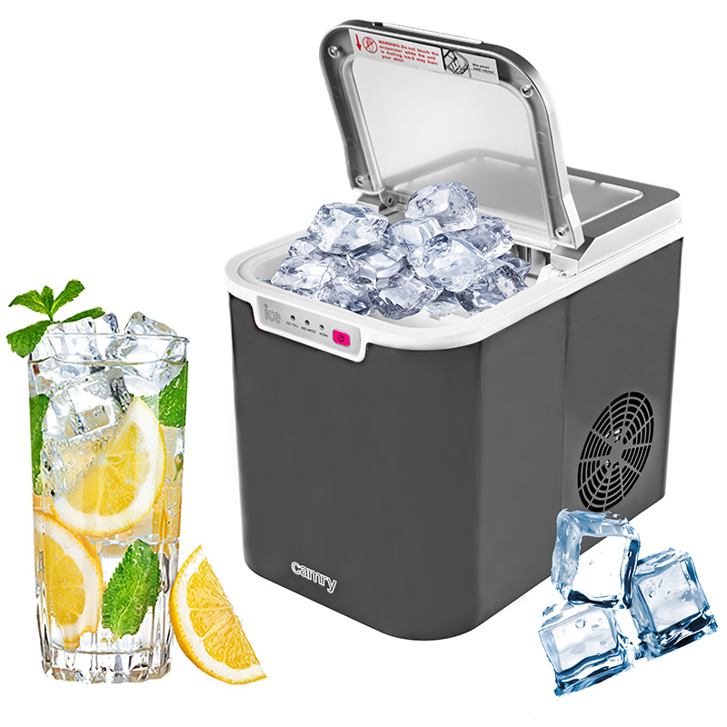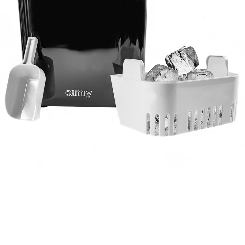 Îți place să bei băuturi reci? Sau poate le servesti oaspeților sau clienților? Cu siguranță vei aprecia aparatul de cuburi de gheață Camry. Produce o jumătate de kilogram de cuburi de gheață pe oră, care sunt depozitate într-o cameră izolată termic. Aparatul de gheata CR 8073 are un rezervor de apa usor de umplut cu o capacitate de 2,2 litri.