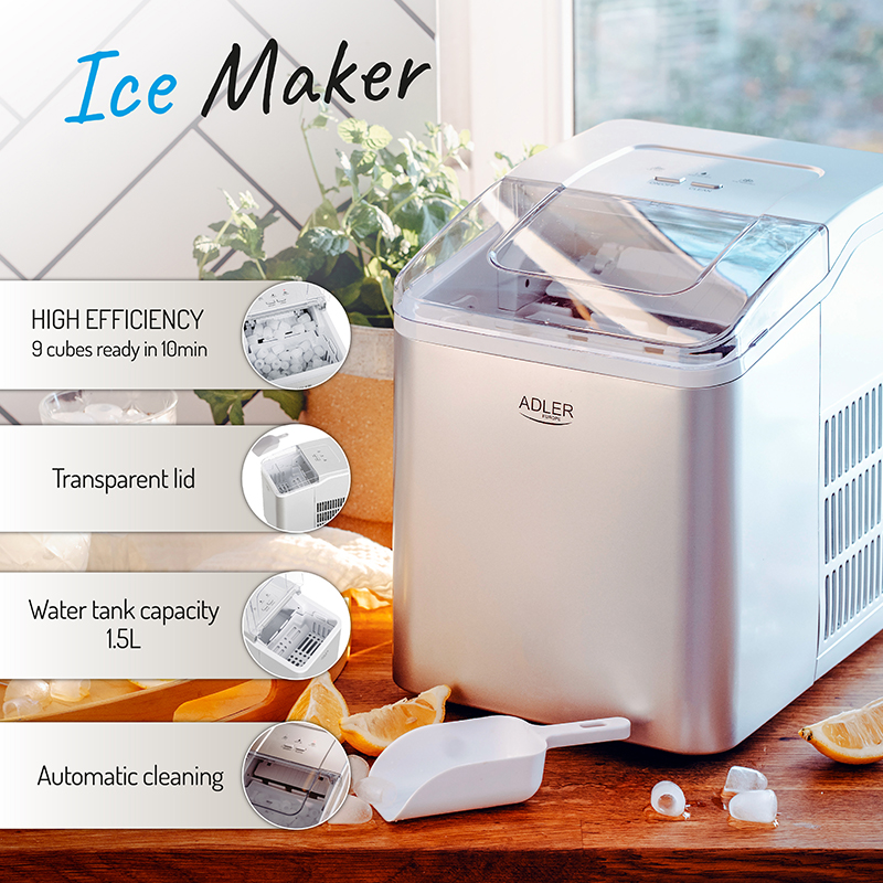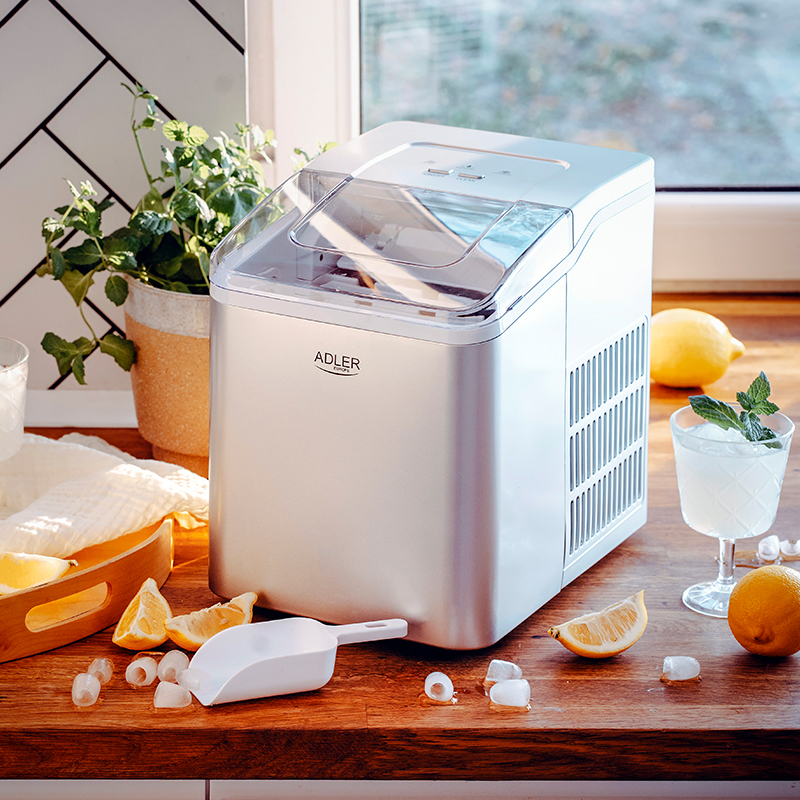 Pregătește rapid cuburi pentru cocktailuri, limonadă sau sucuri cu aparatul de făcut gheață Adler AD 8086. În doar 9–13 minute obții primul set de 9 cuburi, iar capacul transparent îți permite să vezi procesul fără să oprești aparatul. Ideal pentru acasă, birou sau petreceri, când vrei gheață proaspătă oricând.