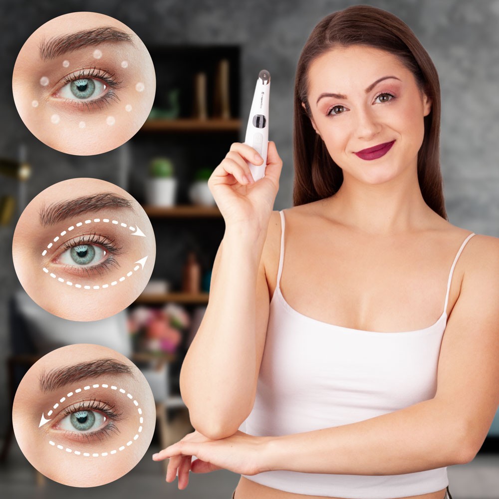 Curatati temeinic pielea cu ajutorul servetelelor de machiante si apa micelara. Dupa curatare, puteti aplica pe pielea din jurul ochilor (vezi prima imagine de mai jos) o crema hidratanta usoara sau o crema de lifting revitalizanta (dispozitivul de masaj poate intensifica efectul acestora ). Pentru a porni dispozitivul, tineti apasat butonul inferior timp de 2 secunde. Toate functiile dispozitivului sunt presetate pentru a porni automat. Puteti seta combinatia de functii dorite apasand in mod repetat acest buton de pornire. Cele doua butoane superioare sunt utilizate pentru a seta temperatura de incalzire a capului (va recomandam sa incepeti cu setarea la cea mai scazuta temperatura). Treceti capul aparatului pe sub si peste ochi asa cum se arata in figura din centrul ochiului spre marginea exterioara si apoi in jurul intregului ochi. Acordati fiecarui ochi cel putin 3 minute de 2 sau 3 ori pe saptamana . Dupa masaj, curatati capul dispozitivului cu un servetel cosmetic.