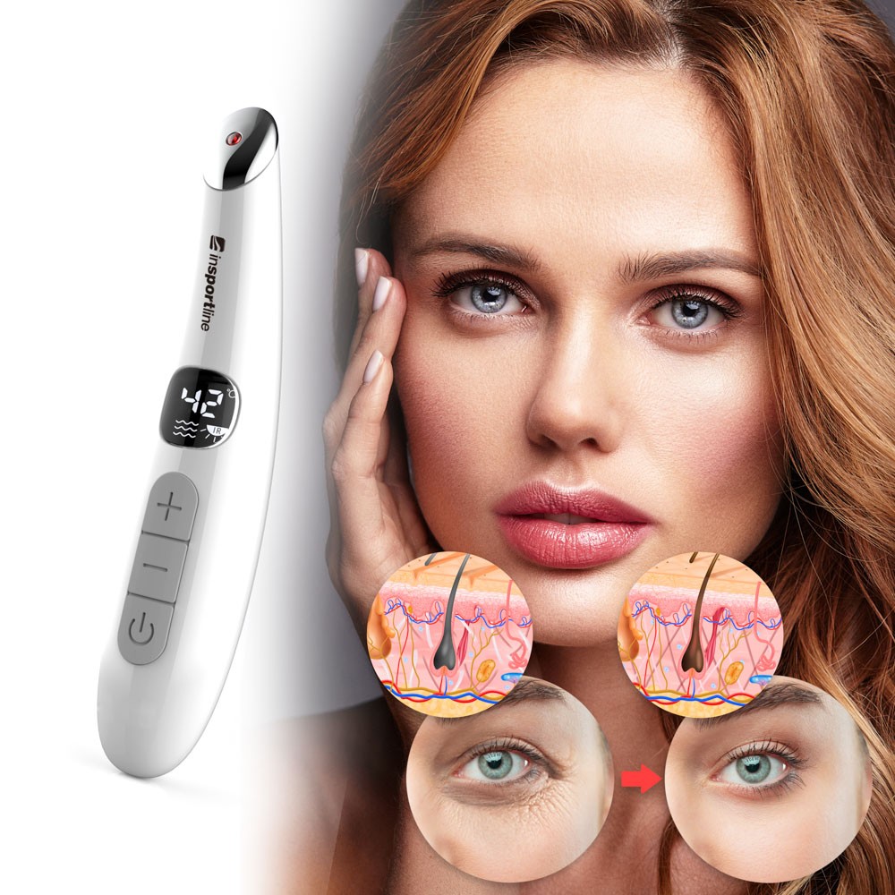 Aparatul de masaj cu radiofrecventa pentru ochi inSPORTline Simbora are alte doua functii. Una dintre ele este vibratia de inalta frecventa cu o frecventa de 10.000 RPM, care imbunatateste circulatia sangelui in zona ochilor si reduce umflaturile de sub ochi. A doua functie este incalzirea capului metalic pana la o temperatura placuta de 42 ° C. Aceasta incalzire relaxeaza muschii si contribuie la regenerarea generala a pielii. Este firesc ca metabolismul pielii sa incetineasca odata cu varsta si sa se formeze riduri pe piele, care se adancesc in timp. Cu toate acestea, cu o ingrijire regulata, puteti preveni sau, eventual, reduce aceste riduri. Atunci cand utilizati dispozitivul Simbora in combinatie cu un produs cosmetic, radiatiile infrarosii asigura o mai buna absorbtie a produsului in profunzimea pielii si in acelasi timp, intensifica efectele produselor cosmetice.