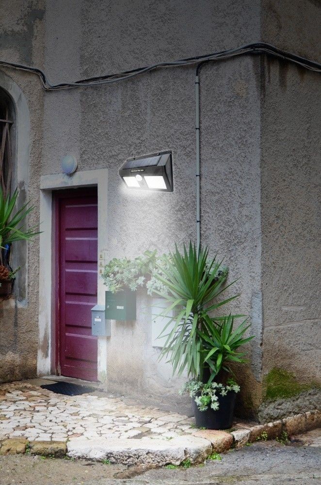 Aplica LED solara are un design modern si face parte din clasa de protectie IP65, ceea ce inseamna ca poate fi montata in gradini, pe pereti exteriori, curti, parcuri, fiind impermeabila si rezistenta la conditiile meteo nefacorabile. Panoul solar se incarca automat pe timpul zilei de la lumina soarelui si se va aprinde automat pe timpul noptii.