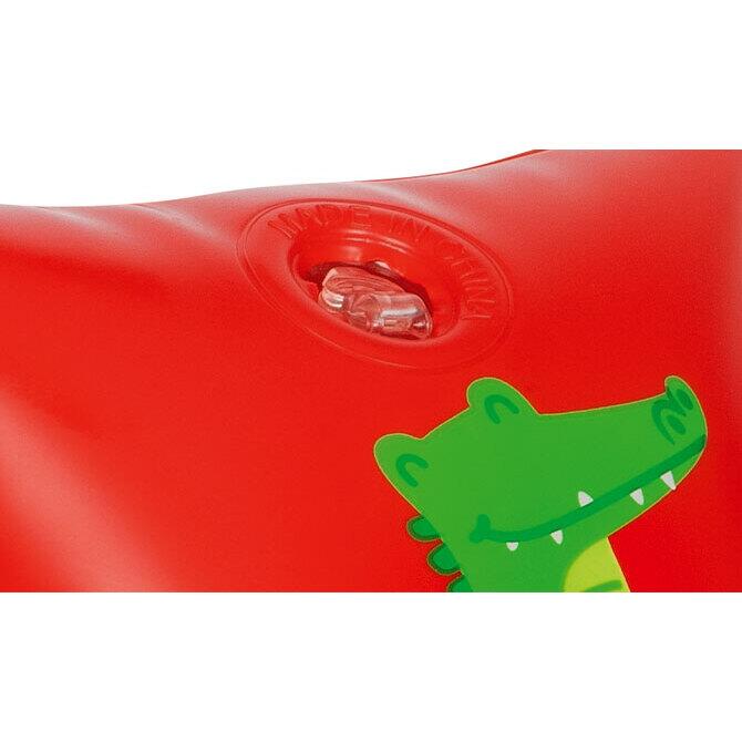 Fabricate din PVC foarte gros (0,3 mm) si completate cu o insertie de material realizata din 98% poliester și 2% elastan, aceste ajutoare pentru flotabilitate ofera durabilitate si siguranta exceptionale. Culoarea rosu stralucitor nu numai ca creeaza un aspect atragator, dar creste si vizibilitatea in apa. Crocodilul simpatic imprimat se anunta a fi prietenul de nadejde al micului inotator.