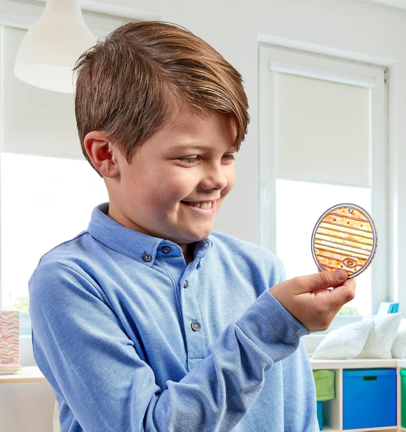 Mod de utilizare: picteaza fiecare planeta folosind vopselele incluse, lasa piesele sa se usuce, apoi agata-le cu ajutorul firului transparent si al ventuzei. Expuse la lumina, planetele devin o decoratiune atragatoare pentru camera copilului.