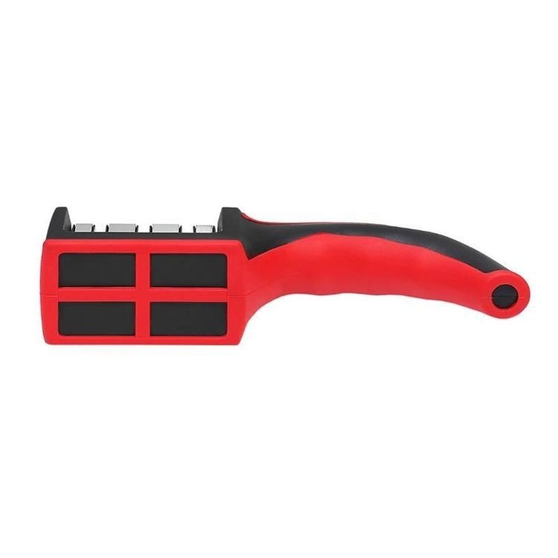 Cum se folosește: așază ascuțitorul pe o suprafață plană, ține mânerul ferm și trage lama cuțitului prin fanta potrivită (1–3), dinspre călcâi spre vârf, de câteva ori, fără a apăsa excesiv.