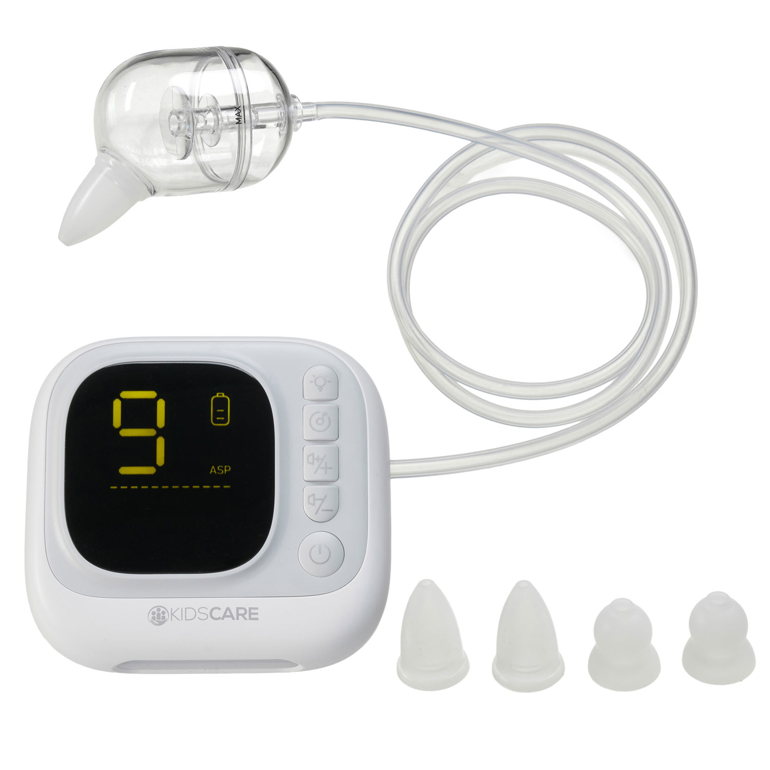 Aspirator nazal electric KidsCare, 9 trepte absorbtie, 4 varfuri, melodii pentru copii, lumina de veghe, acumulator inclus