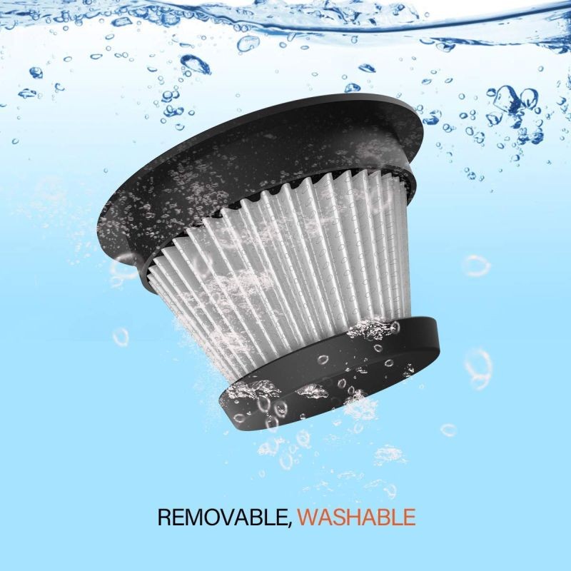 Aspiratorul este prevazut cu filtru Hepa fiind printre cele mai eficiente filtre. Acesta dispune de baterie Lithium-ion cu o capacitate de 2200mAh care poate fi reincarcata la bricheta auto 12-13V. Puterea de aspiratie a dispozitivului este de 6000PA.