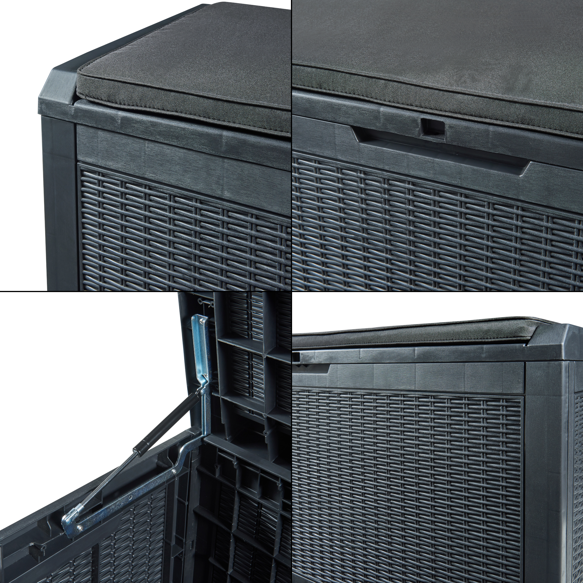Die Innenstruktur der Box ist verstärkt, was die Langlebigkeit erhöht und sicherstellt, dass Ihre Gegenstände sicher aufbewahrt werden. Einfach im Aufbau und Pflege, ist sie die ideale Lösung, um Ordnung in Ihren Außenbereichen zu schaffen.