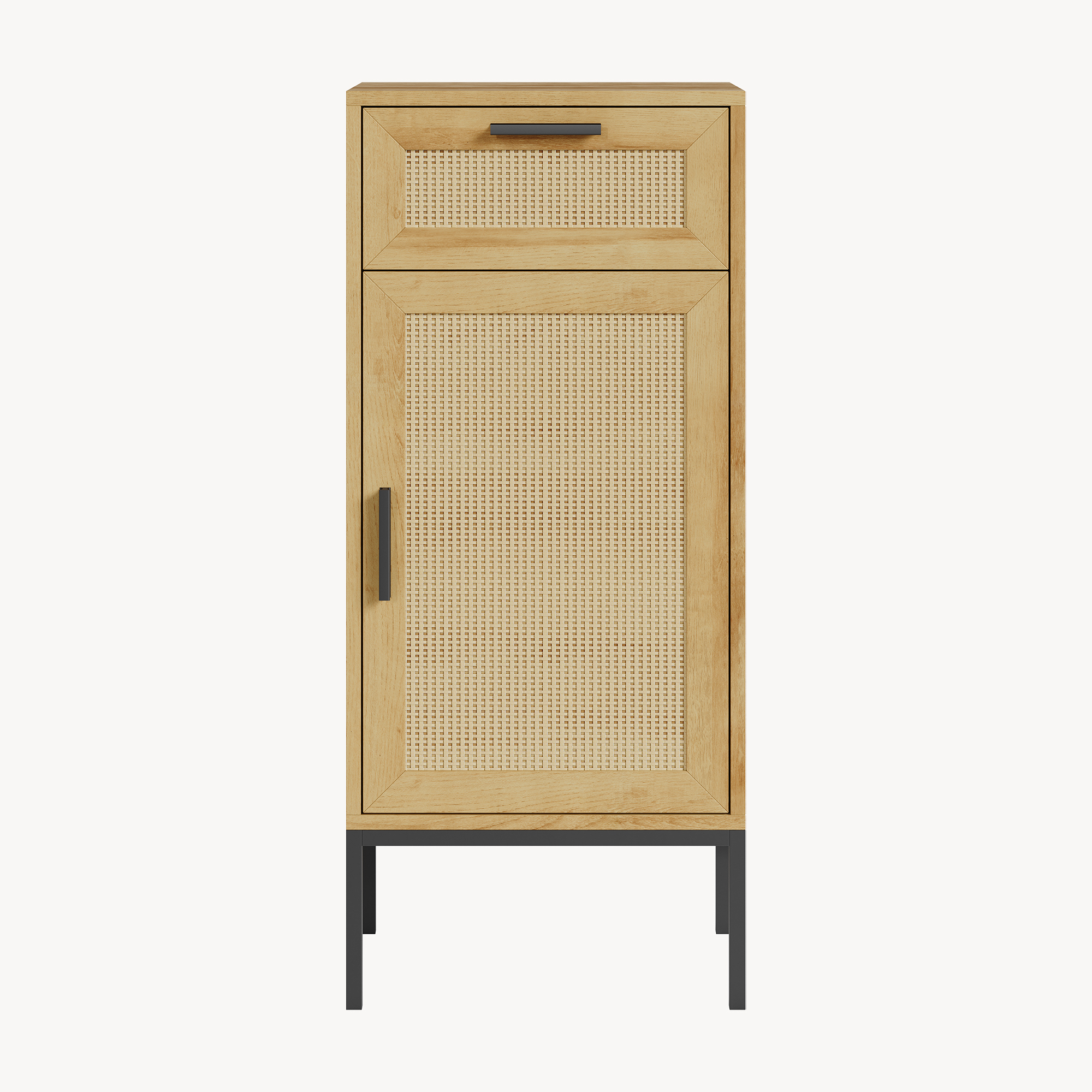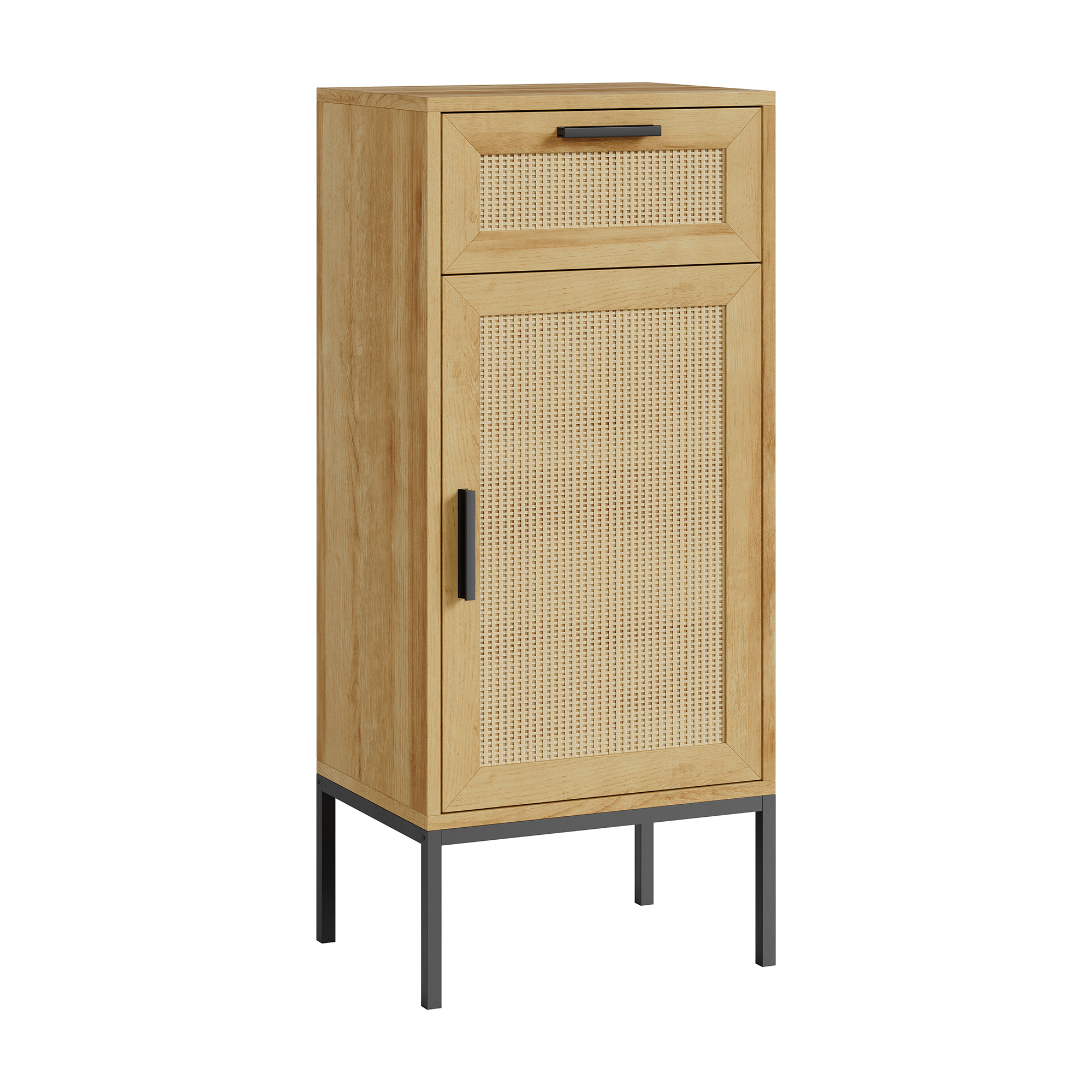 Dank seines zeitlosen Designs passt dieser Beistellschrank zu verschiedenen Einrichtungsstilen und kann natürlich auch in anderen Räumen außerhalb des Badezimmers genutzt werden, je nach Bedarf. Tür- und Schubladenfront sind zudem in dekorativer Rattanoptik gestaltet.