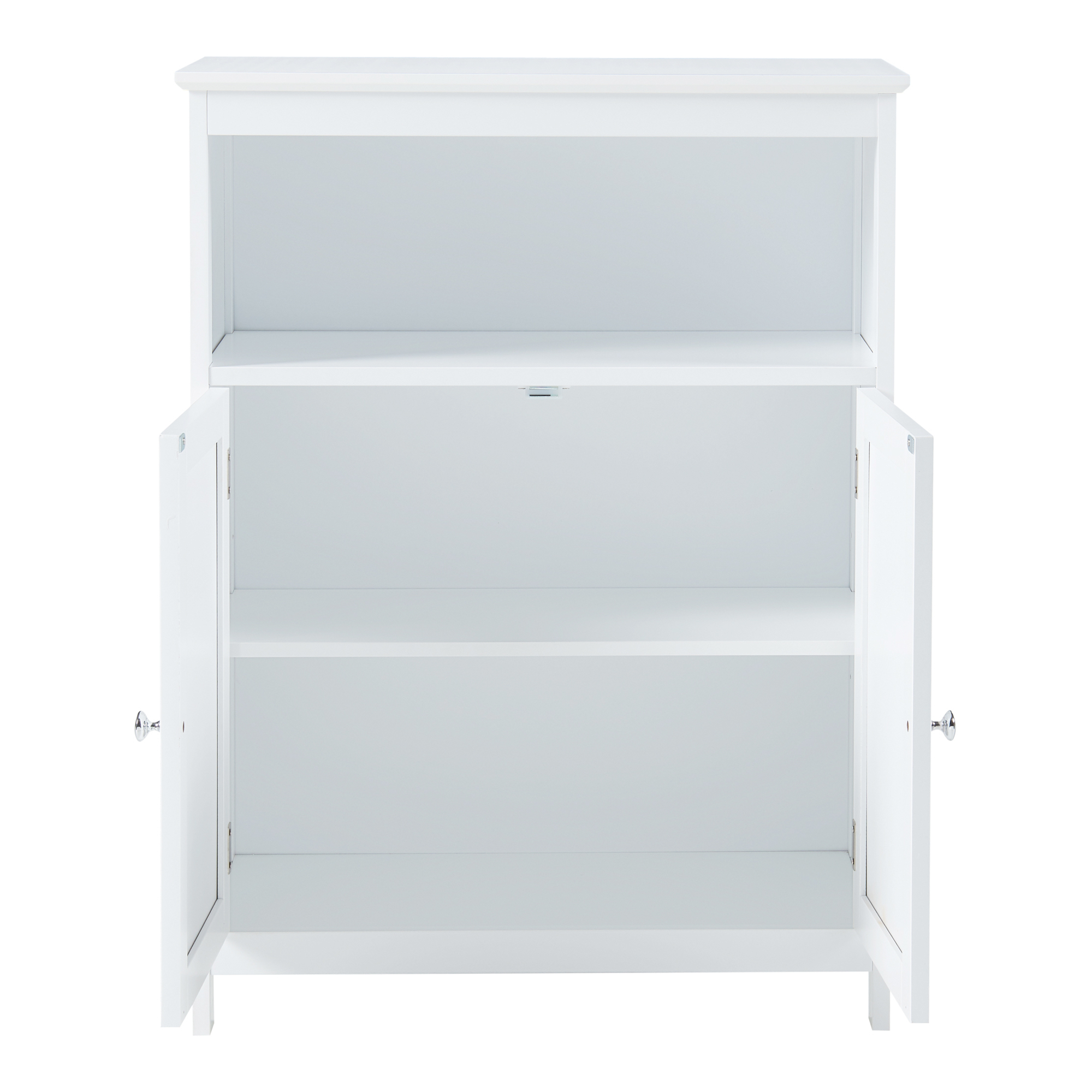 Der Schrank verfügt über zwei Türen und lässt sich dadurch mühelos öffnen und schließen, sodass Sie einen einfachen Zugriff auf Ihre Badutensilien haben. Das offene, obere Ablagefach bietet eine weitere Möglichkeit zum Verstauen von sämtlichen Gegenständen wie bspw. Handtücher, Toilettenpapier oder Reinigungsartikel.