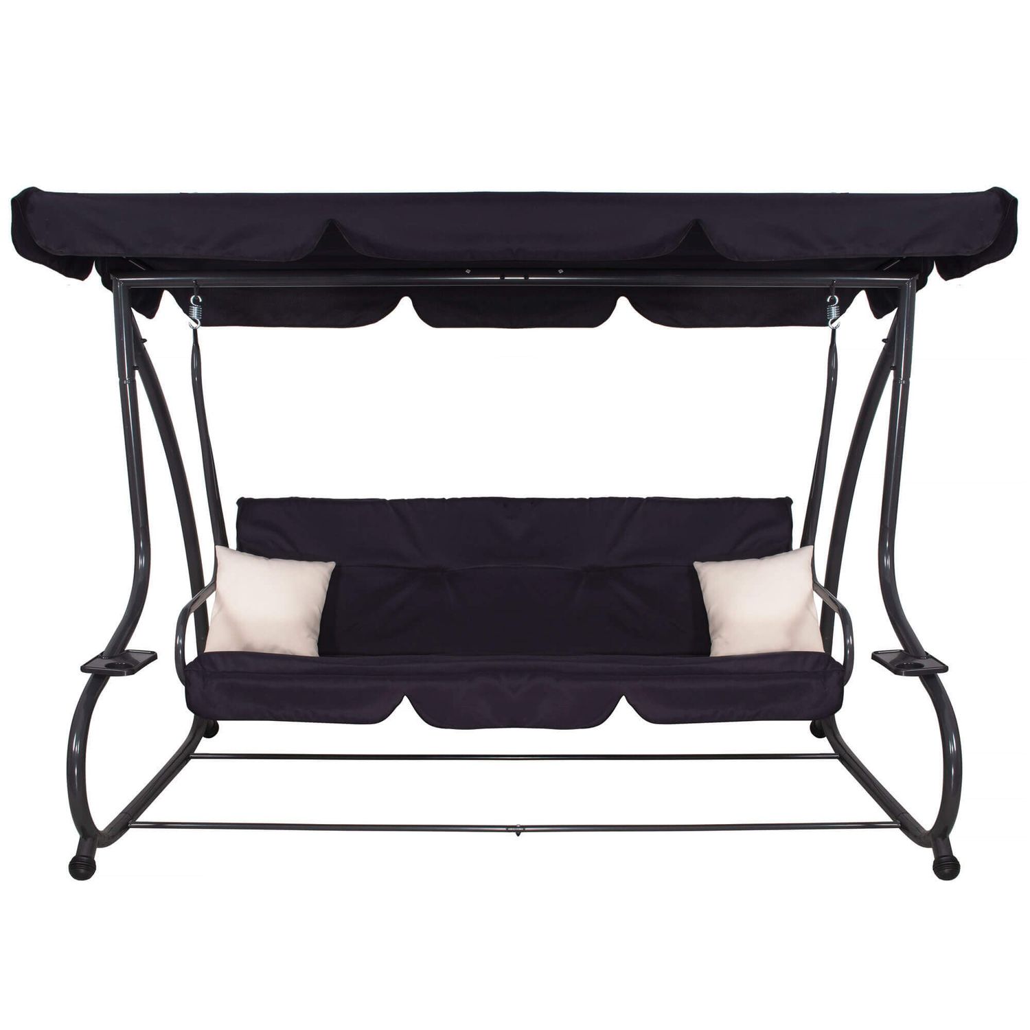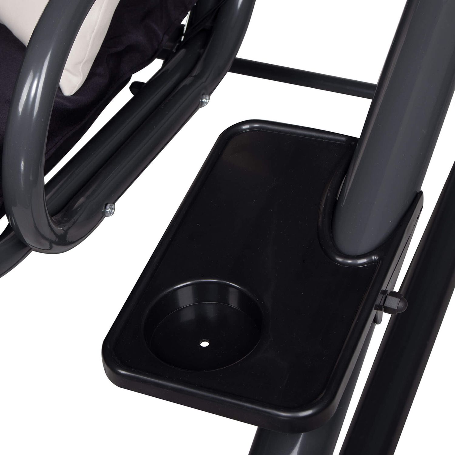 Modelul este prevazut cu parasolar reglabil, util pentru protectie impotriva soarelui pe parcursul zilei, iar pernele incluse sporesc confortul la fiecare utilizare. Cadrul solid din otel vopsit in camp electrostatic, fixarea pe arcuri si picioarele cu capete antiderapante contribuie la o experienta sigura si stabila. In plus, suporturile laterale pentru bauturi adauga un plus de comoditate atunci cand vrei sa te relaxezi fara griji.