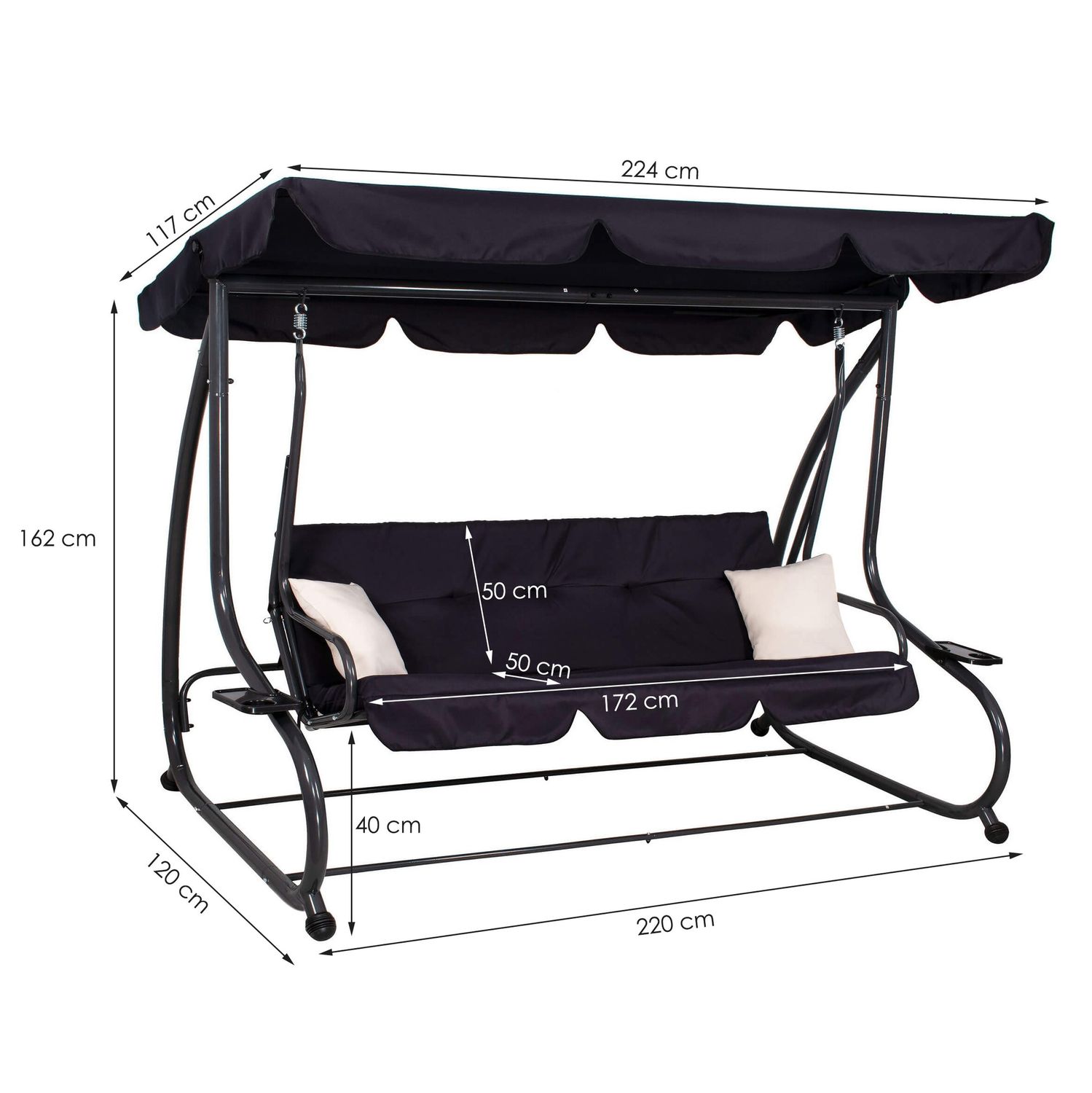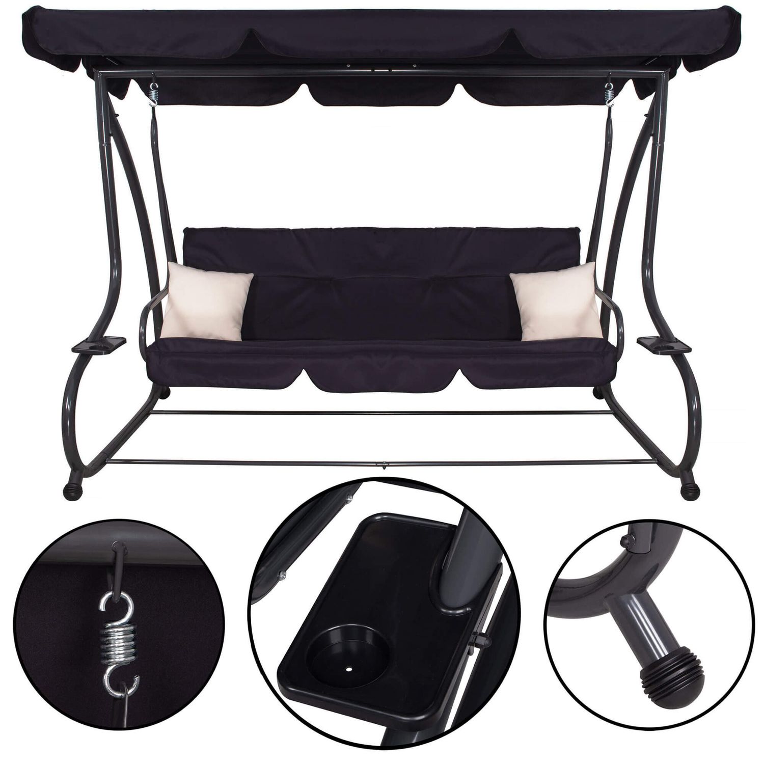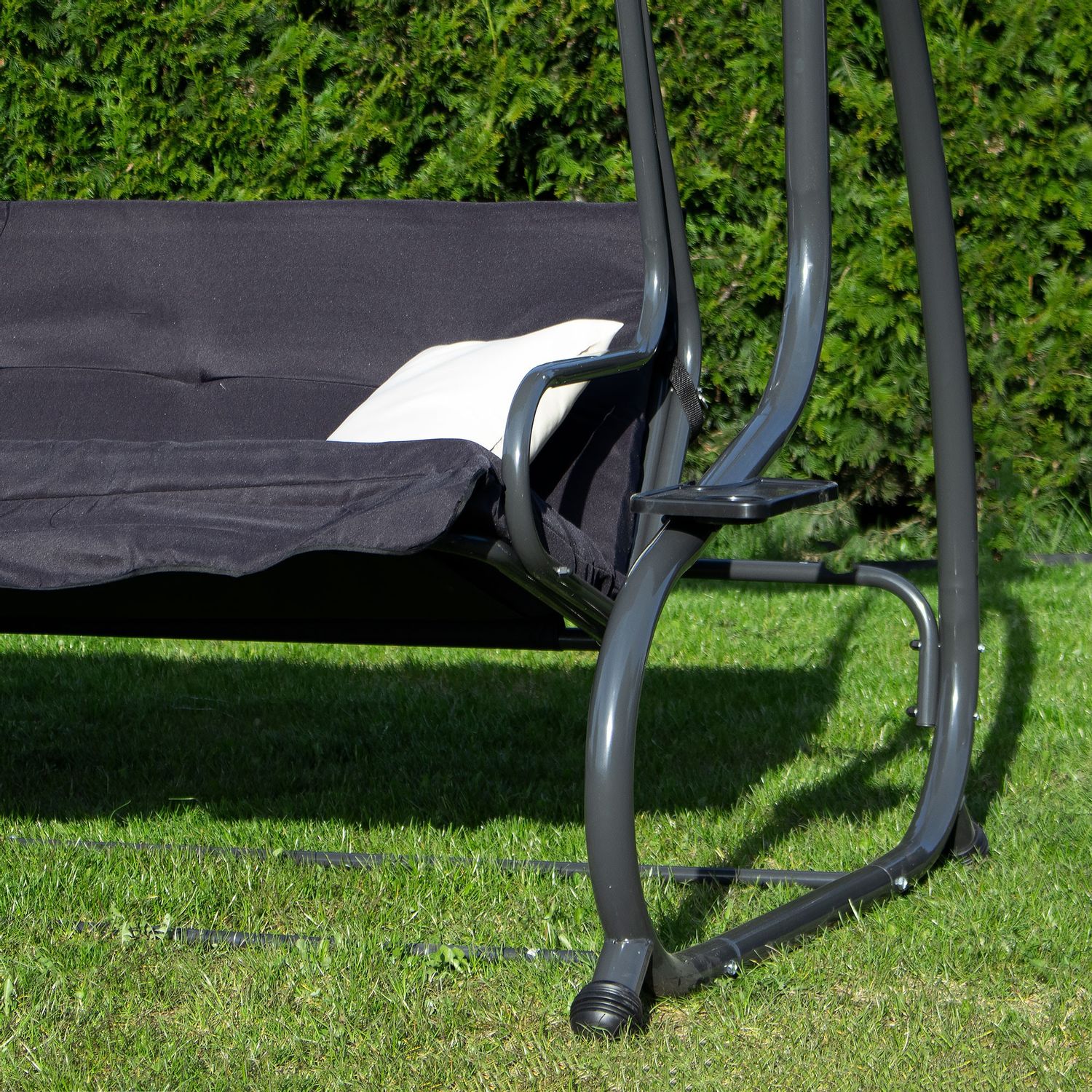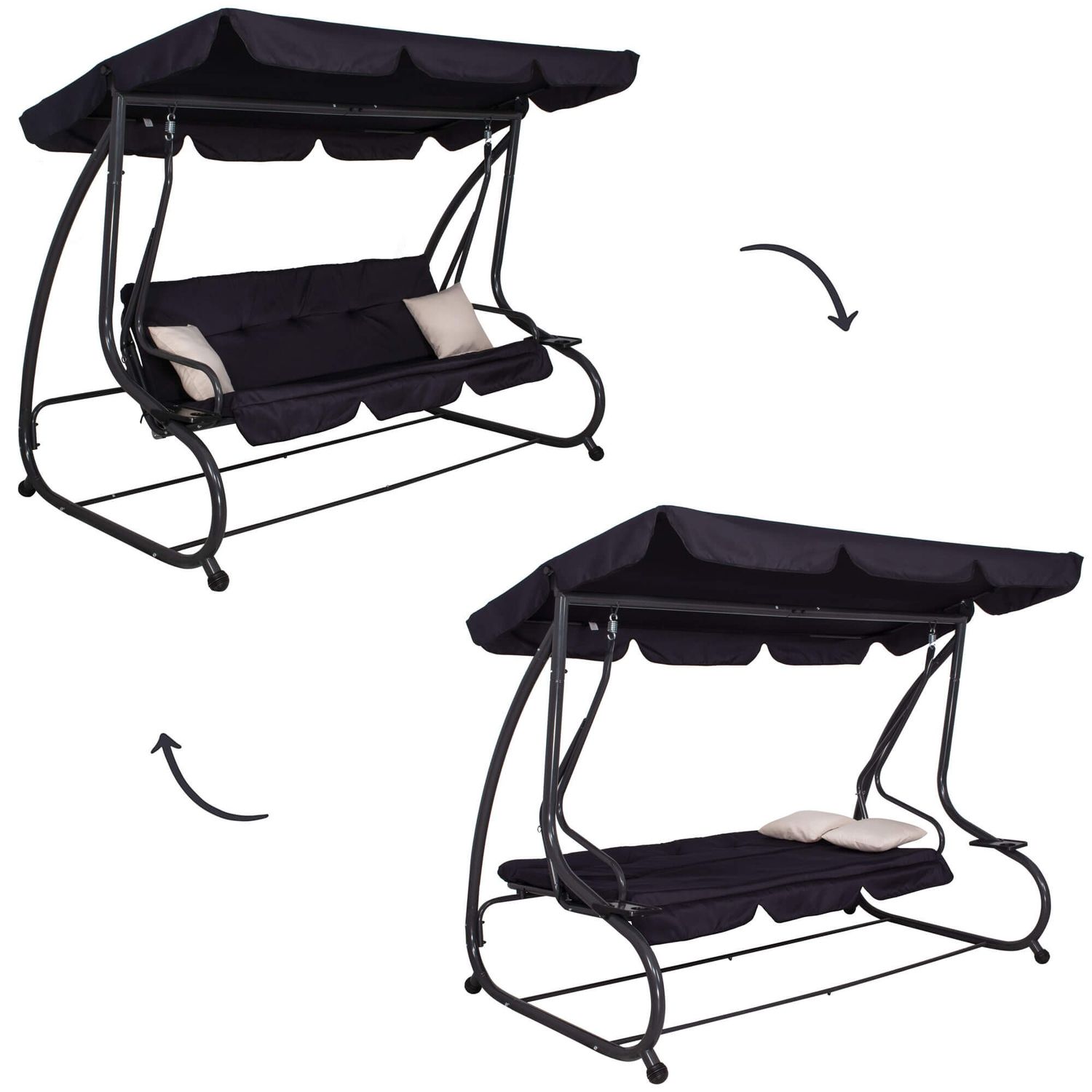 Bucura-te de momente de relaxare in aer liber cu acest balansoar de gradina 4 persoane Sersimo Madrid, conceput pentru confort, stabilitate si utilizare practica zi de zi. Designul elegant in nuanta neagra, completat de perne crem, se potriveste usor pe terasa, in curte sau pe balconul spatios. Datorita functiei de rabatare, balansoarul se transforma rapid intr-un leagan de gradina tip pat, perfect pentru odihna dupa o zi aglomerata.