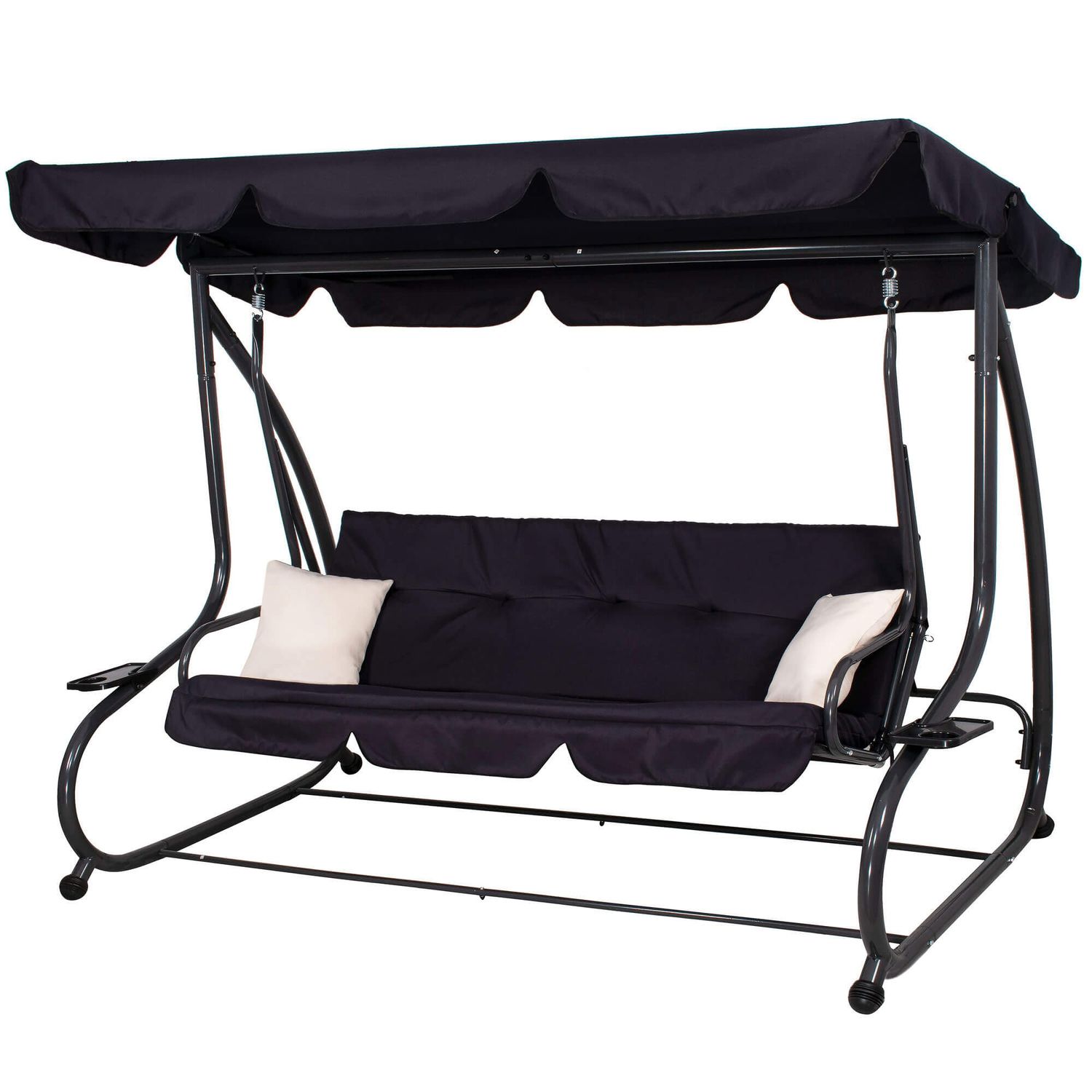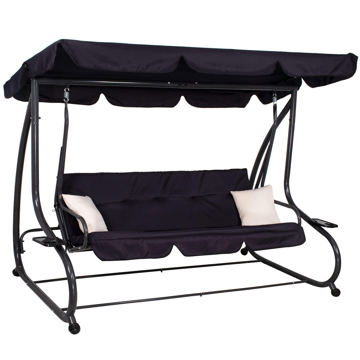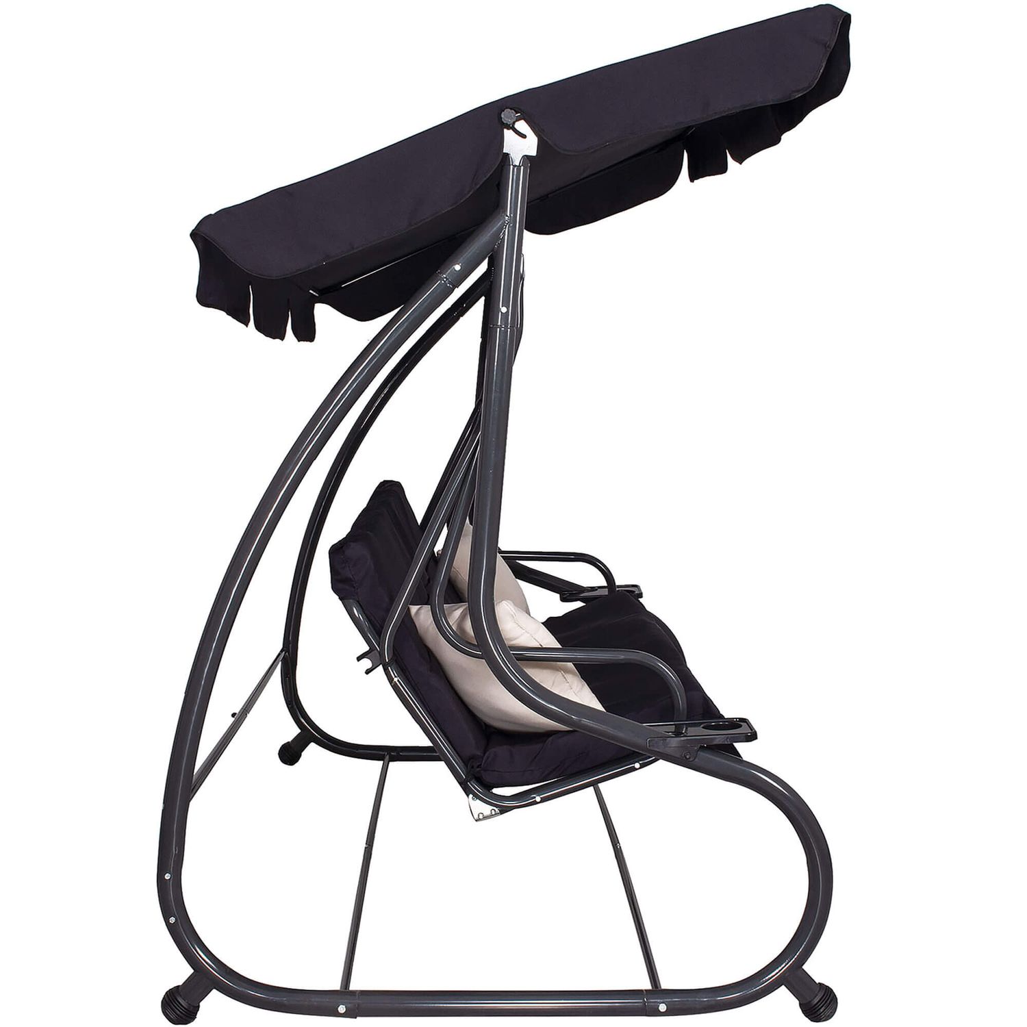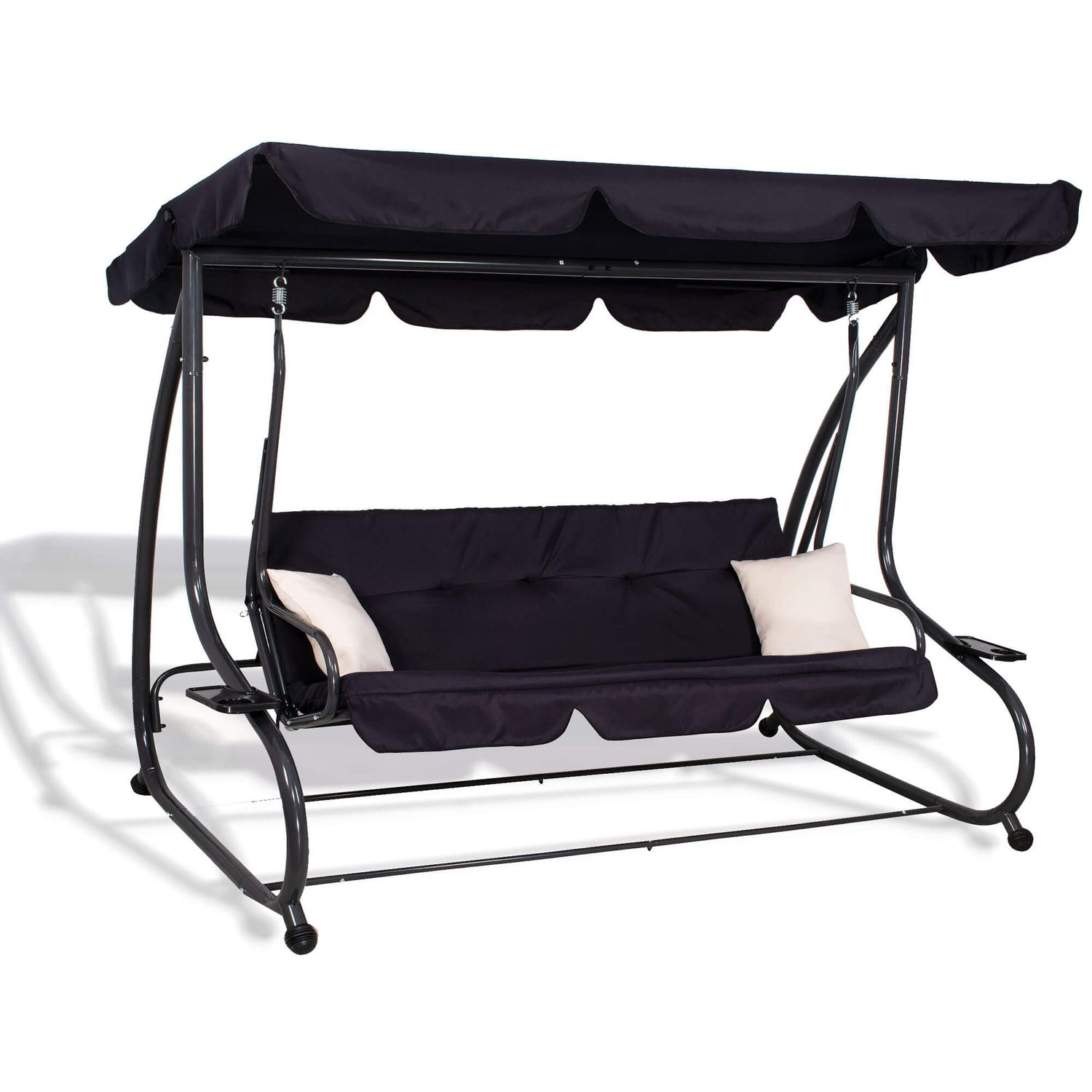 Bucura-te de momente de relaxare in aer liber cu acest balansoar de gradina 4 persoane Sersimo Madrid, conceput pentru confort, stabilitate si utilizare practica zi de zi. Designul elegant in nuanta neagra, completat de perne crem, se potriveste usor pe terasa, in curte sau pe balconul spatios. Datorita functiei de rabatare, balansoarul se transforma rapid intr-un leagan de gradina tip pat, perfect pentru odihna dupa o zi aglomerata.