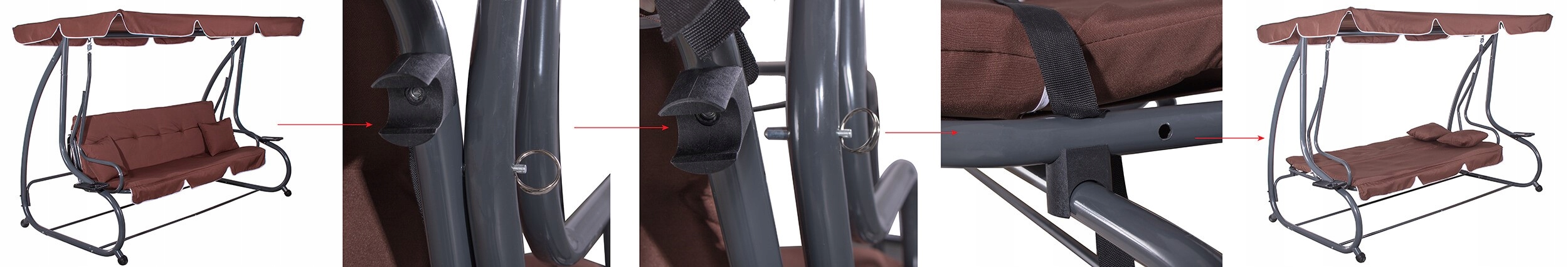 Structura solida din otel vopsit in camp electrostatic sustine pana la 280 kg, iar sistemul de fixare pe arcuri asigura o balansare placuta si stabila. Parasolarul reglabil te ajuta sa te protejezi de soare pe parcursul zilei, iar pernele moi si impermeabile sporesc confortul la fiecare utilizare.