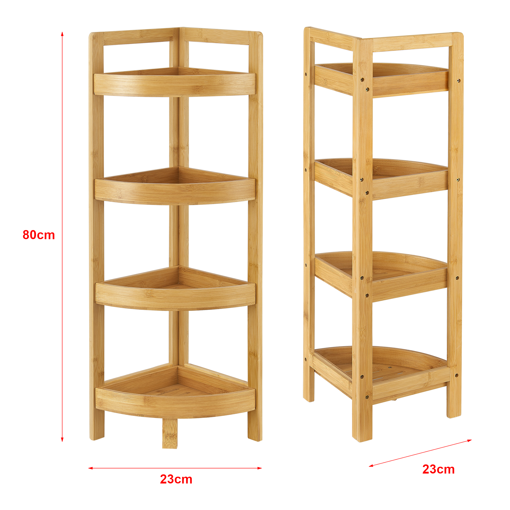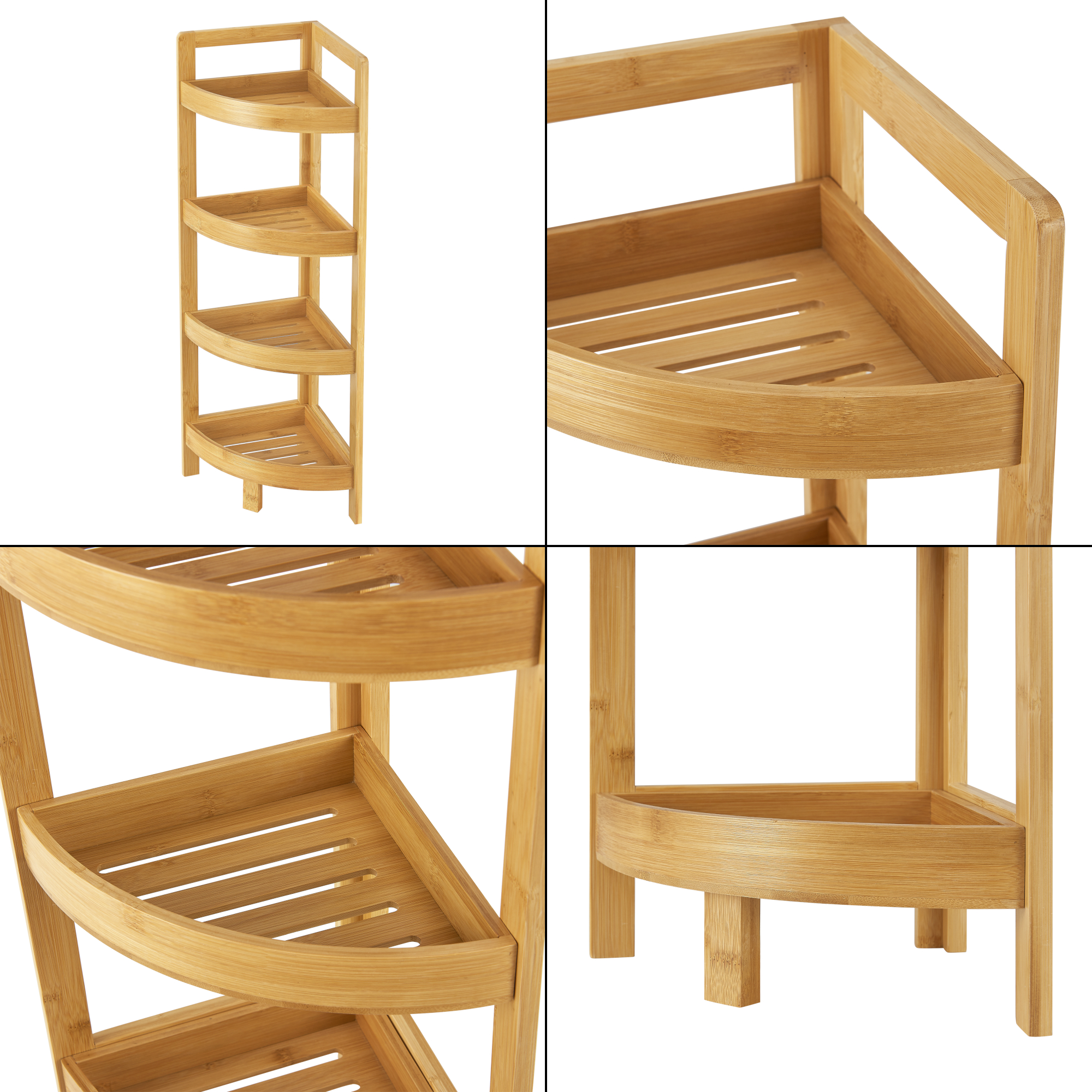 Das praktische Winkelregal aus Bambus ist maximal platzsparend und eignet sich bspw. perfekt für Ihre Küche oder Ihr Badezimmer. Es verfügt über 4 Ablagen zum Verstauen von sämtlichen Badutensilien oder Küchenartikeln.
