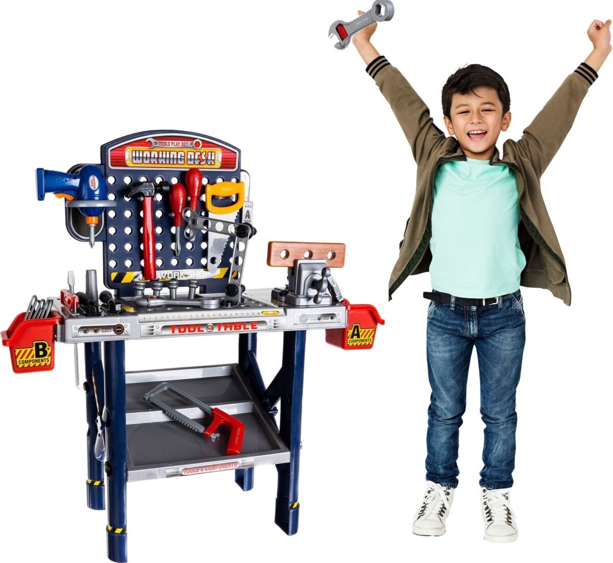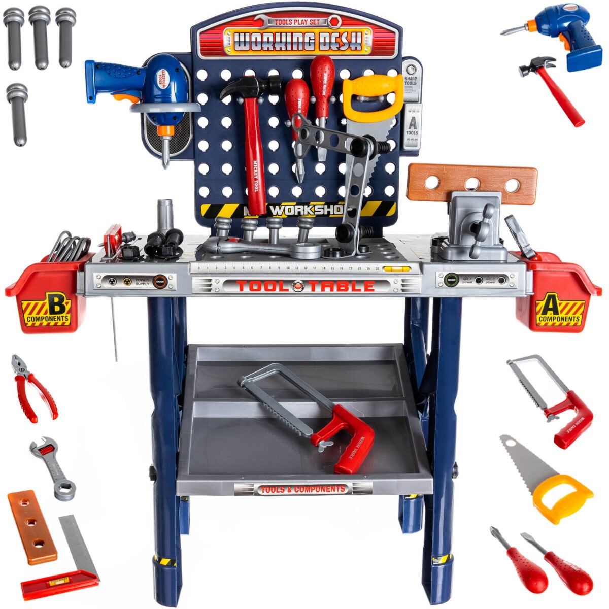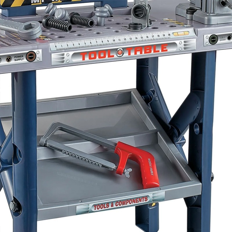 Panoul vertical are găuri și cârlige pentru agățarea uneltelor, iar bormașina electrică pentru copii adaugă un plus de realism jocului (funcționează pe baterii).