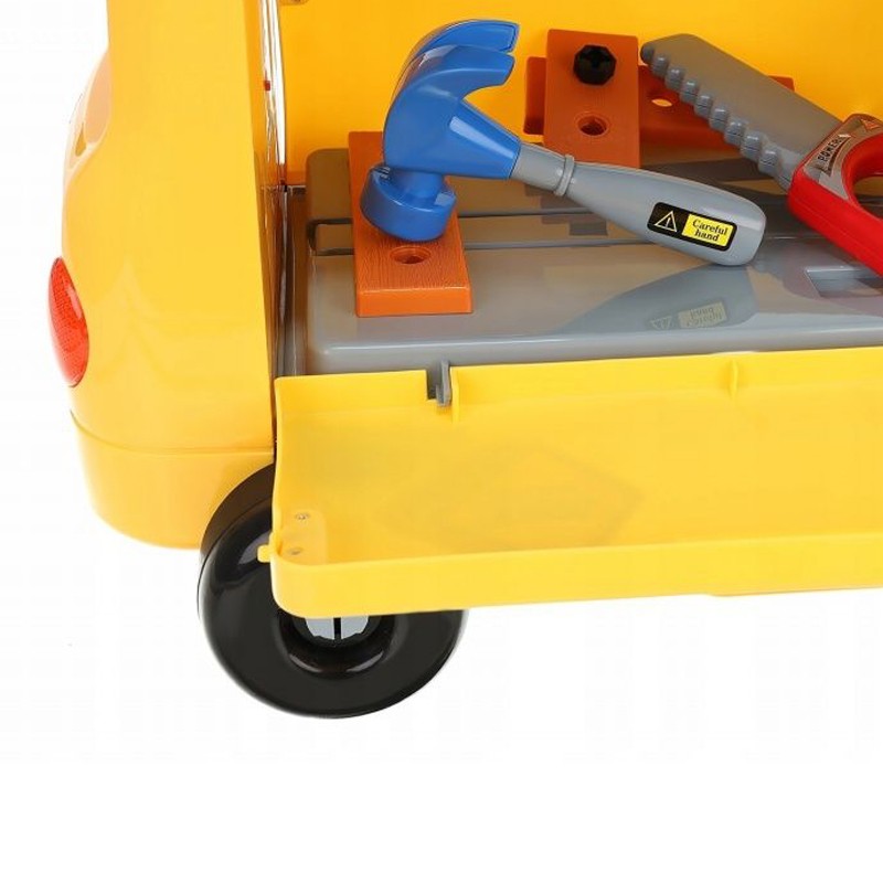 Bancul de lucru in forma de autobuz este ideal pentru orice copil cu varsta de peste 3 ani, acesta avand diverse accesorii, precum: chei, surubelnita, ciocan, suruburi, placi si organizator pentru suruburi.