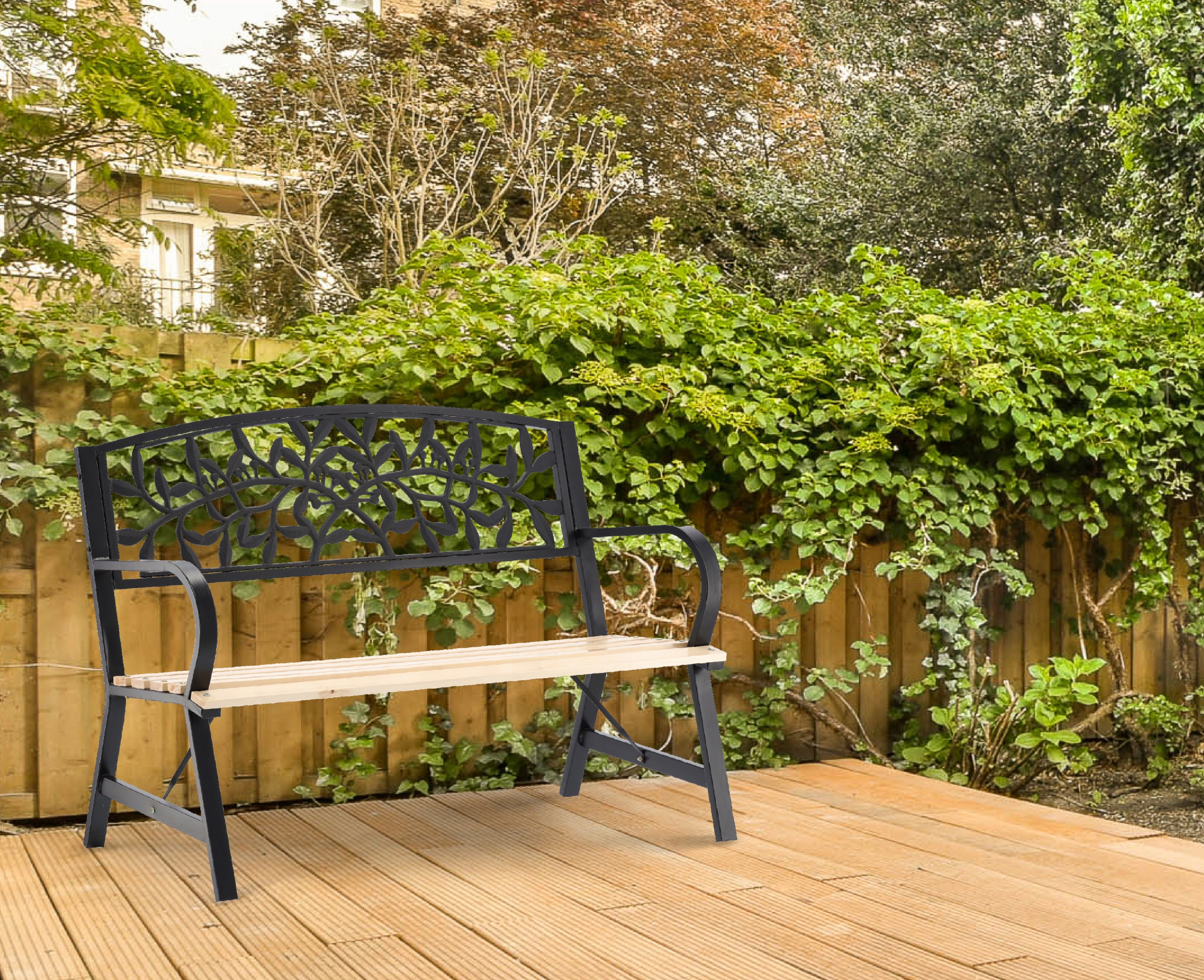 Banca de gradina din lemn si otel, cu spatar decorativ, 120 cm