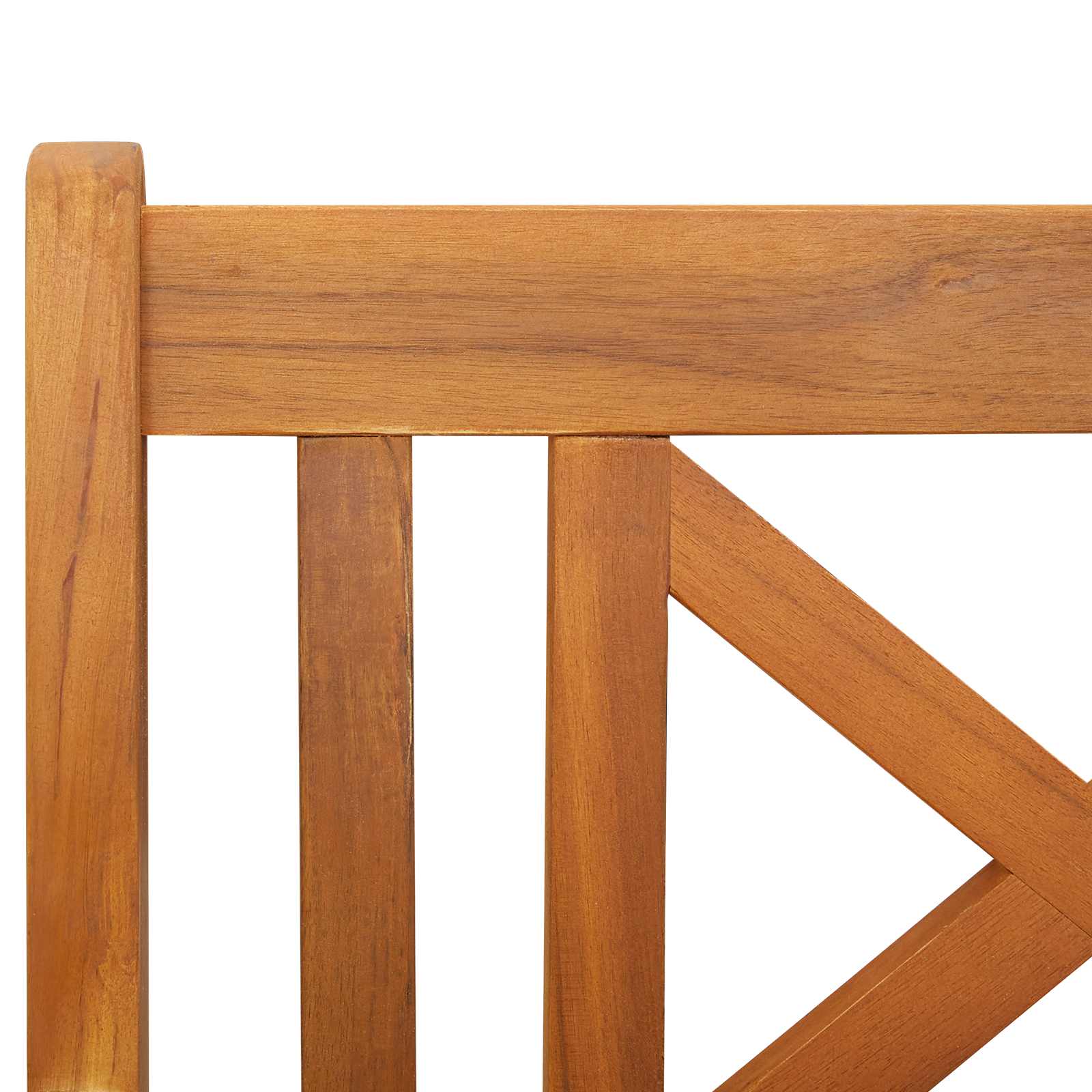 - Materiale: Banca este din lemn masiv de acacia, ideal pentru exterior, rezistent la ploaie și raze UV. Aceasta adaugă un aspect natural și are o durabilitate excelentă.