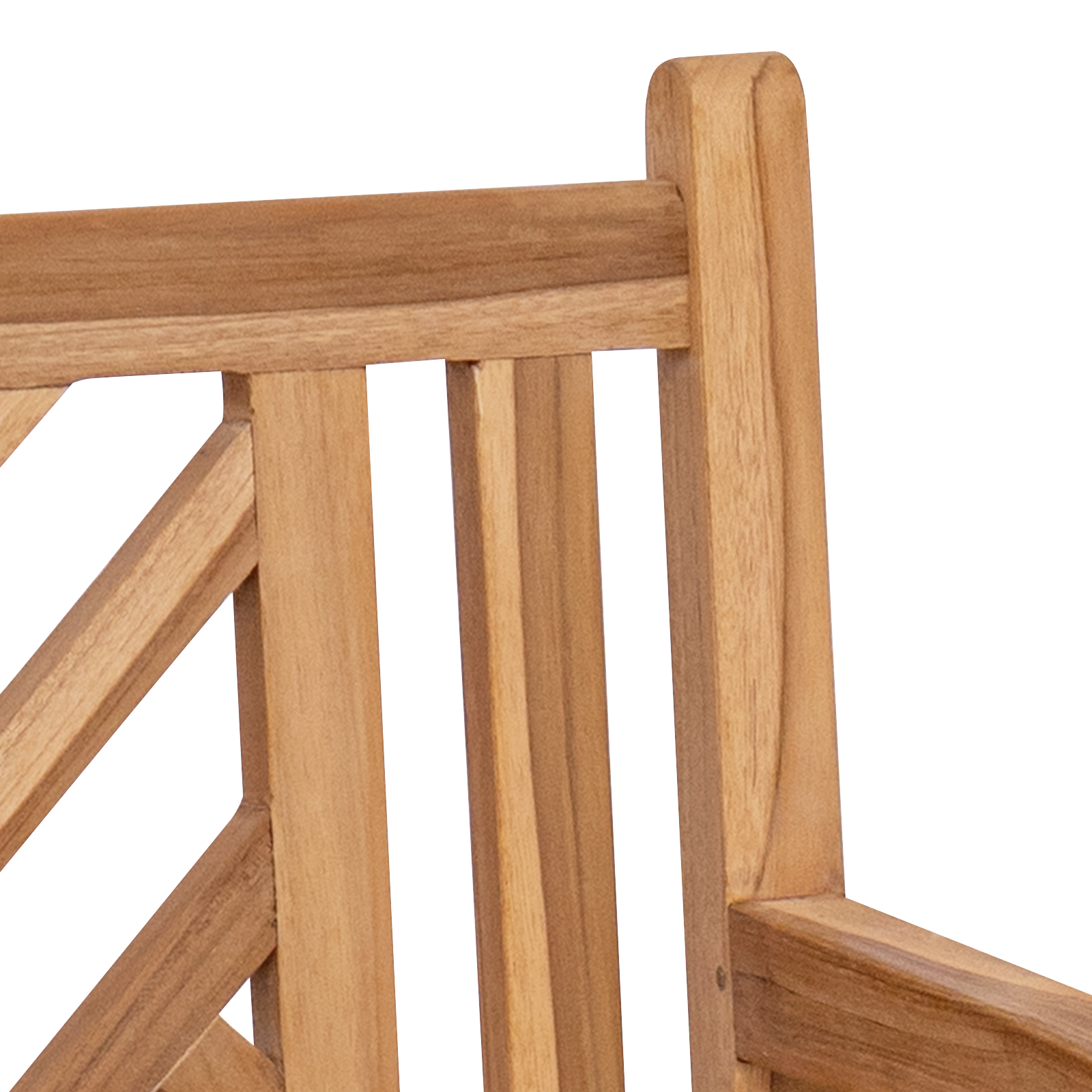 - Material din Teak Solid Fabricată din lemn masiv de tec de cea mai bună calitate, banca asta e super durabilă și are un aspect rustic fain. Granulația naturală a lemnului îi dă un farmec care se potrivește perfect în orice grădină. E atât de rezistentă încât face față la toate tipurile de vreme fără să se deformeze.