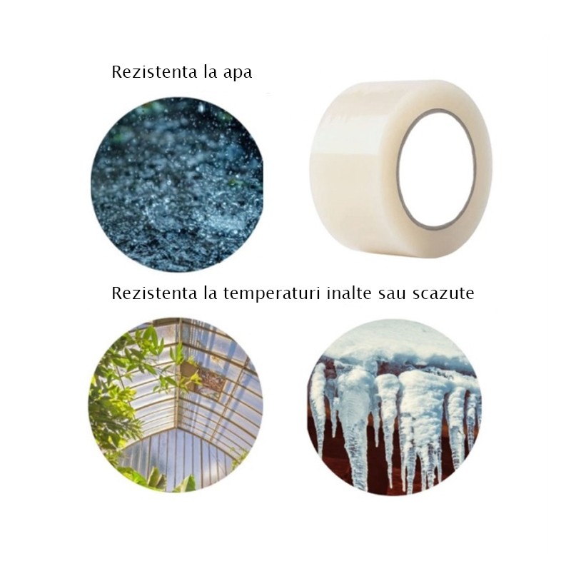 Banda adeziva are o formula speciala de lipire, care asigura o fixare puternica pe folie, ramanand ferma chiar si in conditii de temperaturi extreme sau umiditate ridicata. Materialul este tratat pentru a rezista la razele solare, prevenind deteriorarea prematura cauzata de expunerea constanta la soare.
