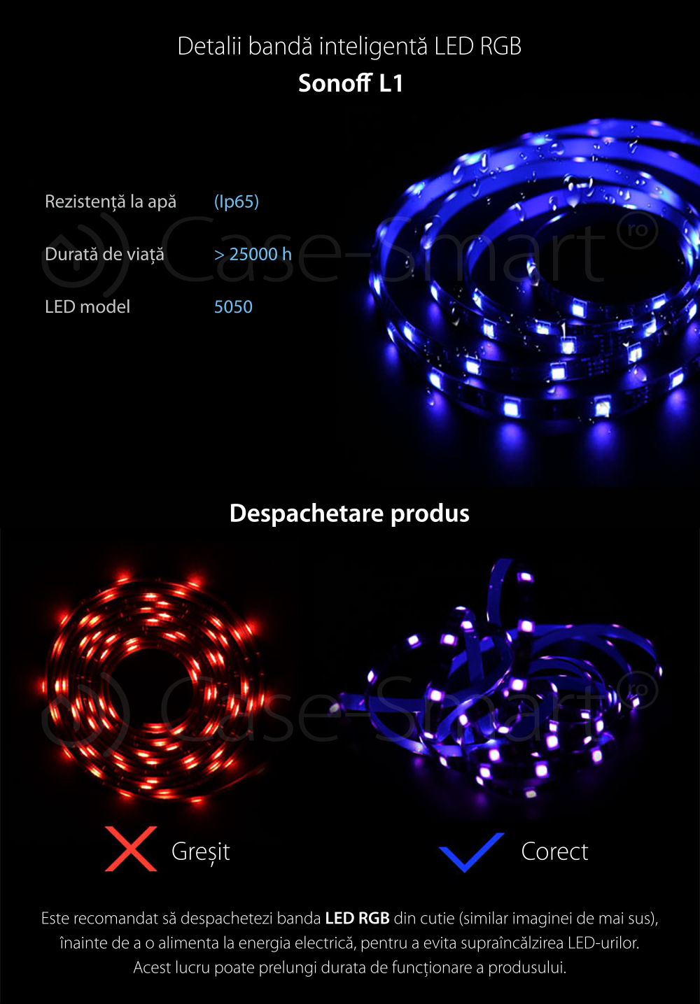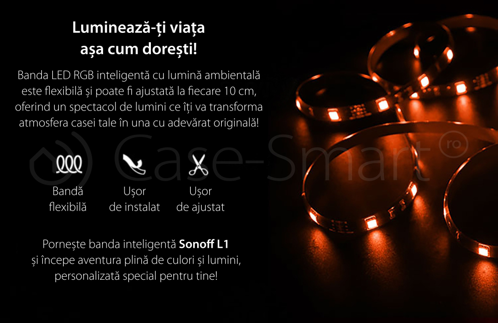 Banda inteligenta Wireless Light Strip LED RGB Sonoff L1, Lungime 5 m, Telecomanda inclusa, Control vocal, Control de pe telefonul mobil SmartElectro IntelligentHouse